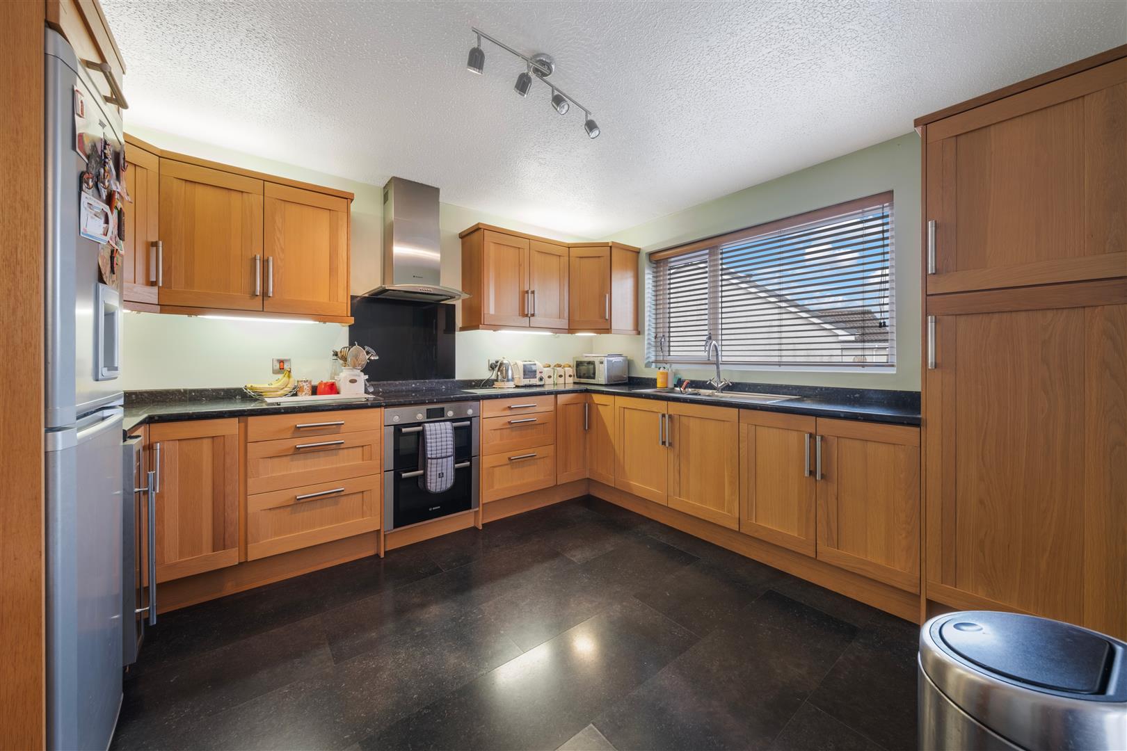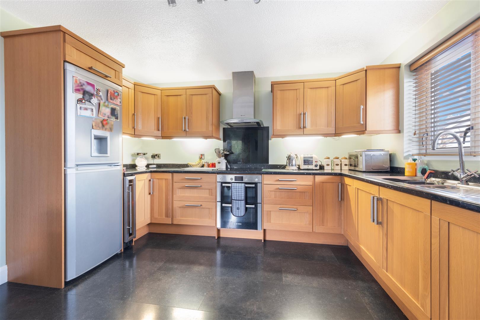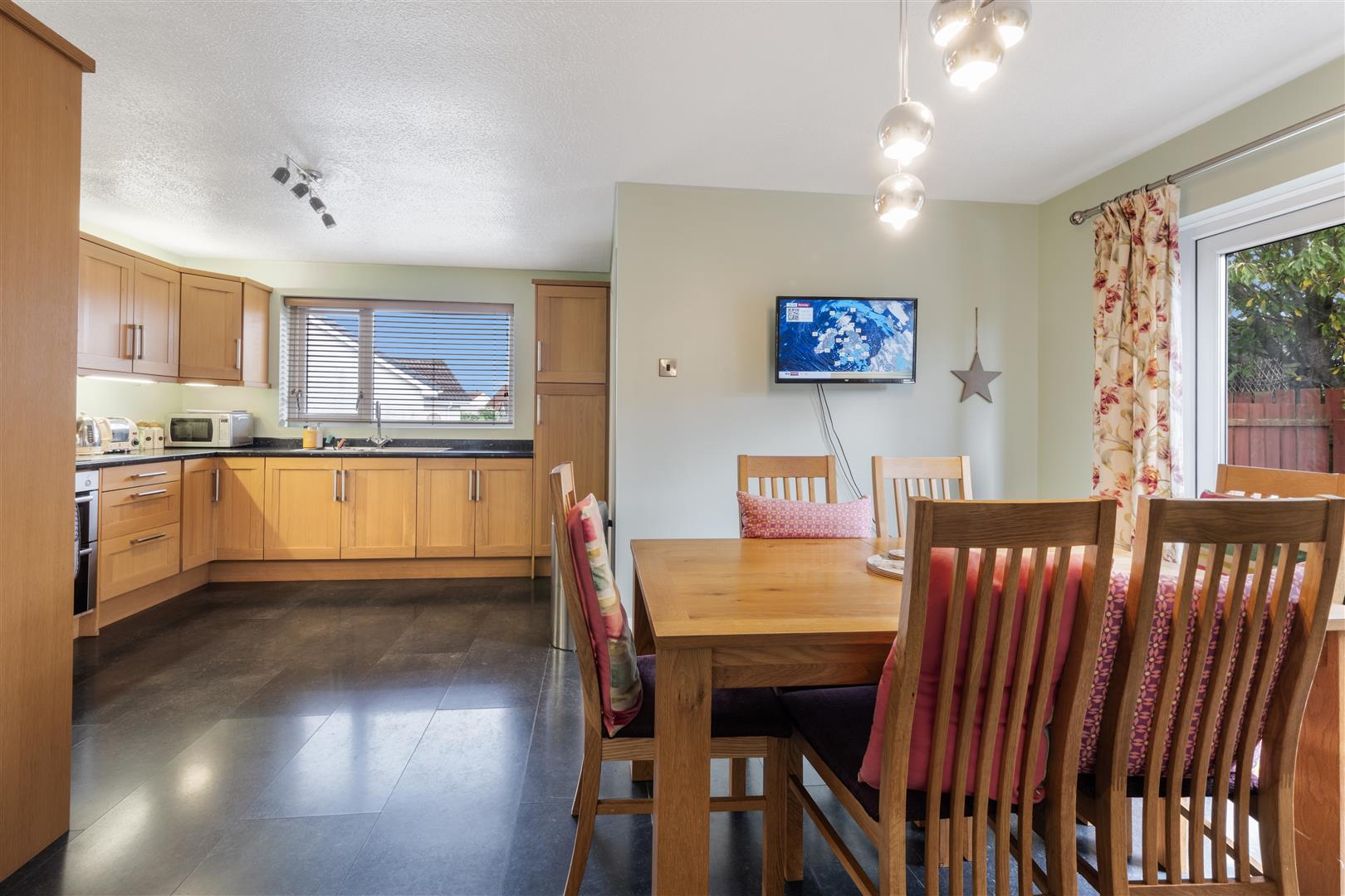 Internally, the property is presented to a high standard throughout and offers well proportioned accommodation comprising a bright entrance hall, spacious living room with feature bay window and stove, and an open plan kitchen/dining area with patio doors leading out to the rear garden, with a separate utility room and back door access.
