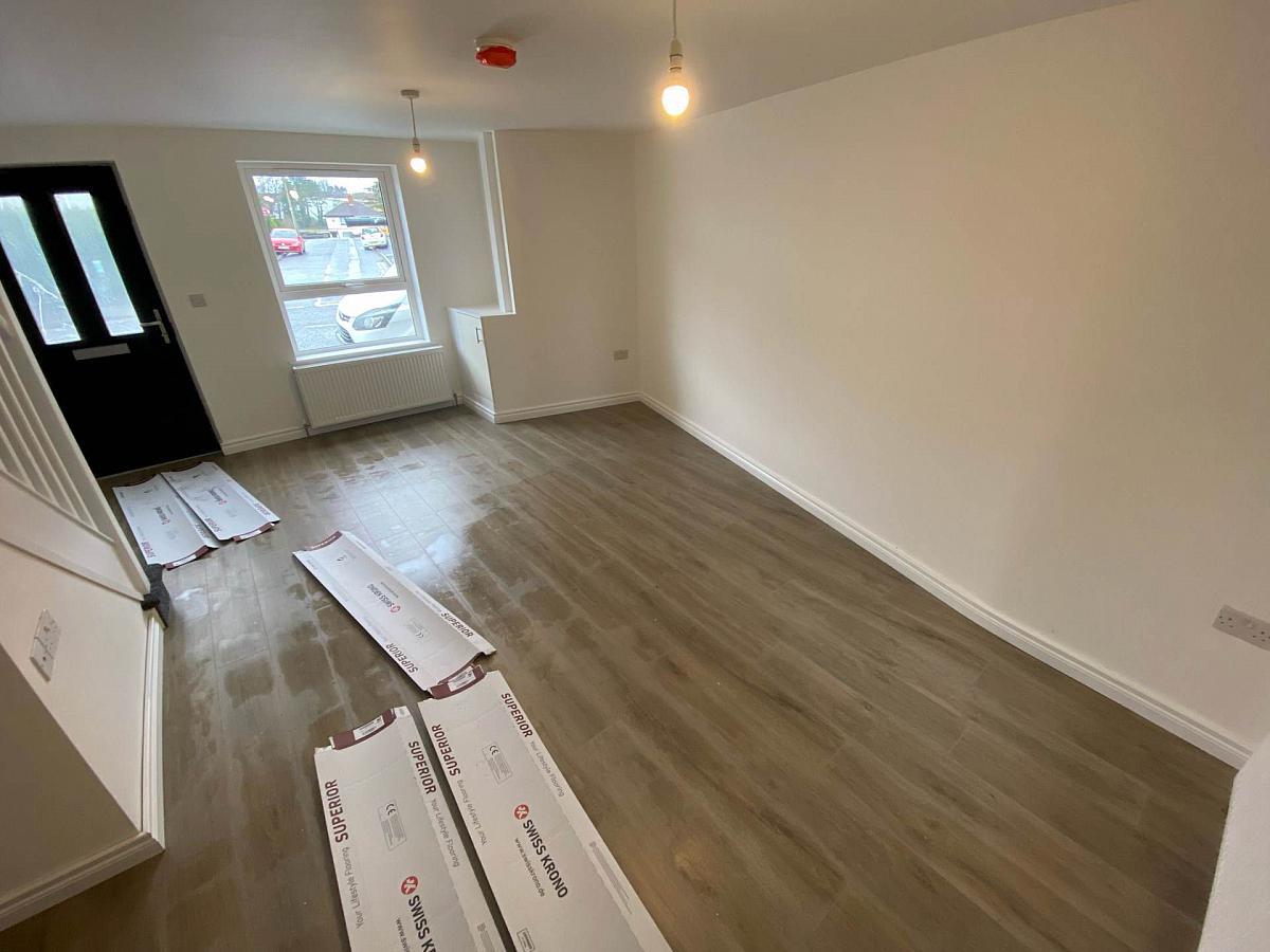 Spacious living room neutrally decorated and laminate wood flooring. Ample dining area.