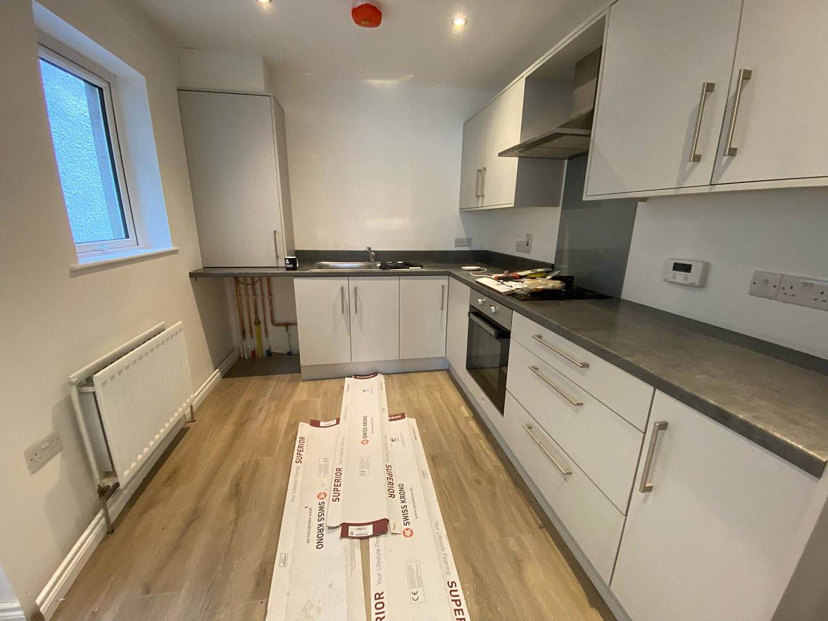 Modern fitted kitchen with range of high and low level units. Built-in oven and ceramic hob.