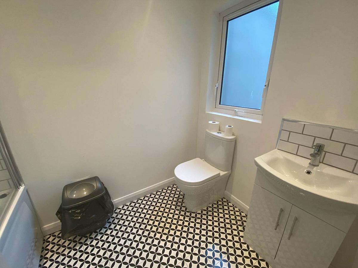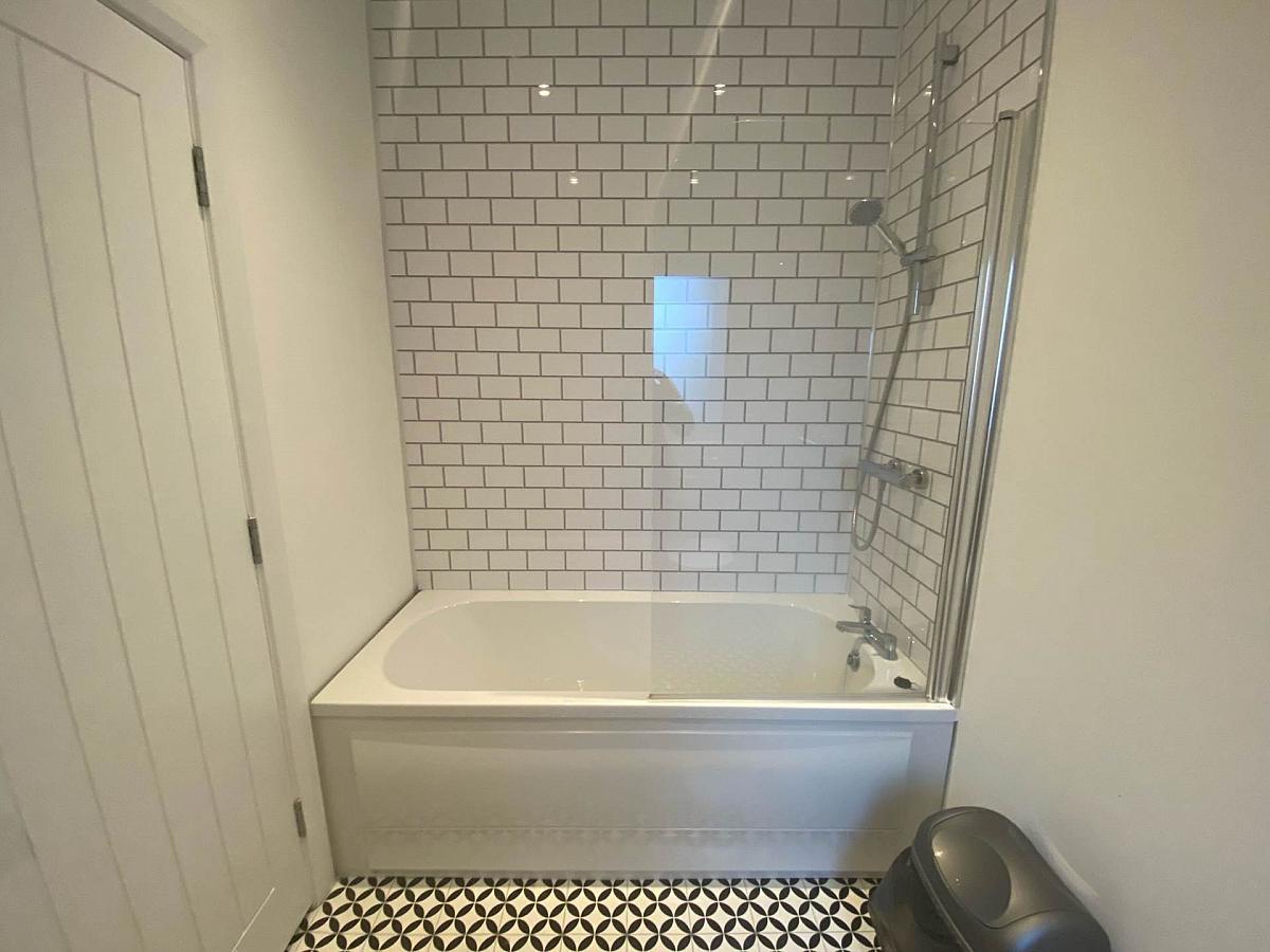 Contemporary family bathroom with white bath suite and thermostatic shower.