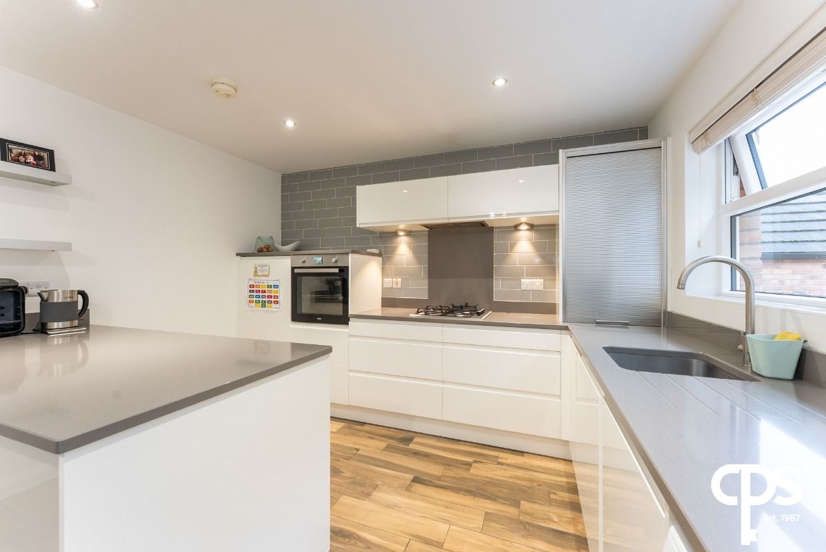 A contemporary open-plan kitchen fitted with a range of high-gloss units, integrated oven and hob, stylish tiled splashback and wooden effect tile flooring. The dining area offers generous space for a family table and chairs, with patio doors opening out to the private rear garden perfect for family living and entertaining.