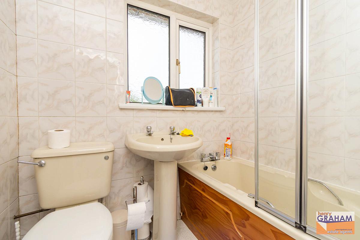 Coloured suite. Panelled bath. Mixer tap. Thermostatic shower and shower screen. Pedestal wash hand basin. Close couple low flush WC. Tiled walls.