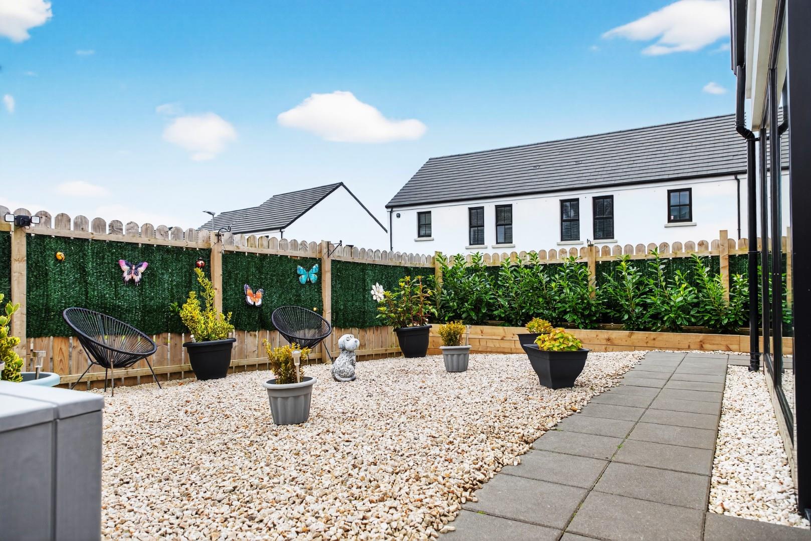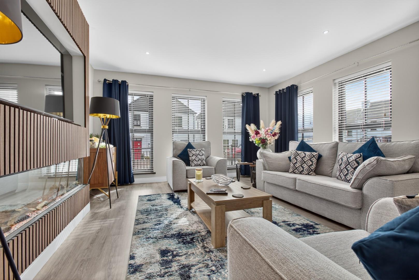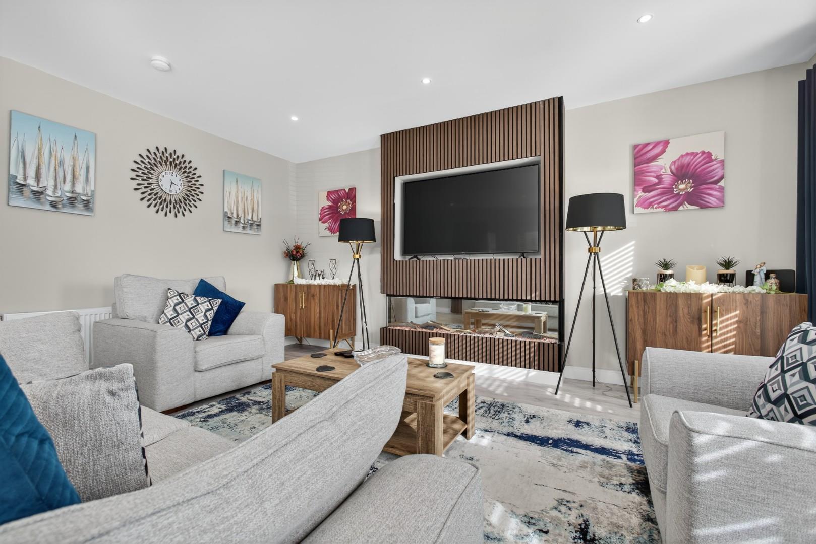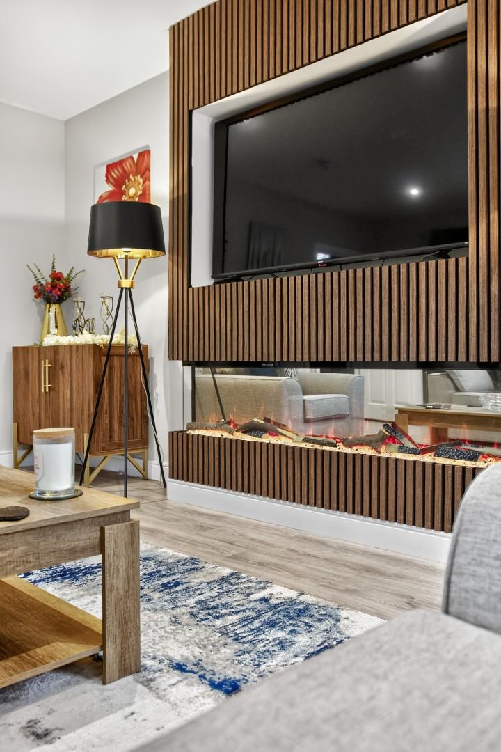 The property boasts a host of high-quality internal and external features, including a private driveway, enclosed rear garden, paved pathways, front door lighting and a modern designer kitchen. Inside, you'll find stylish tiling and wooden floors throughout, solid wood internal doors, ample storage, TV points in all bedrooms, and a contemporary media wall with an electric fire in the living room.