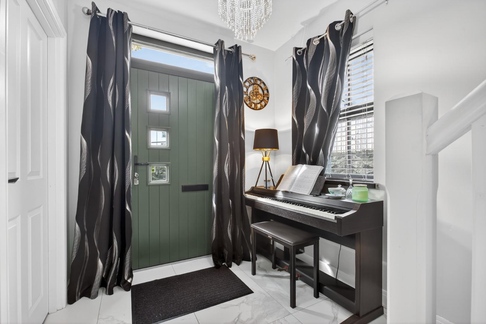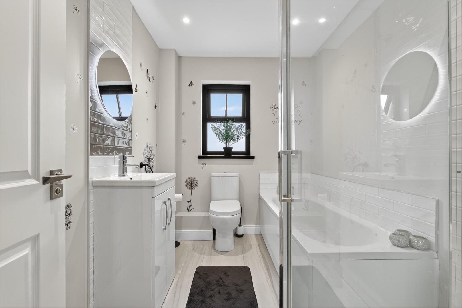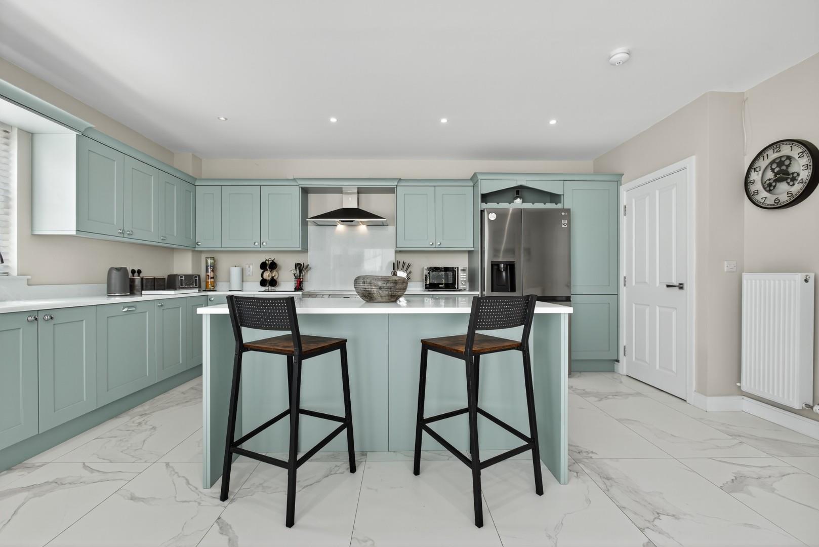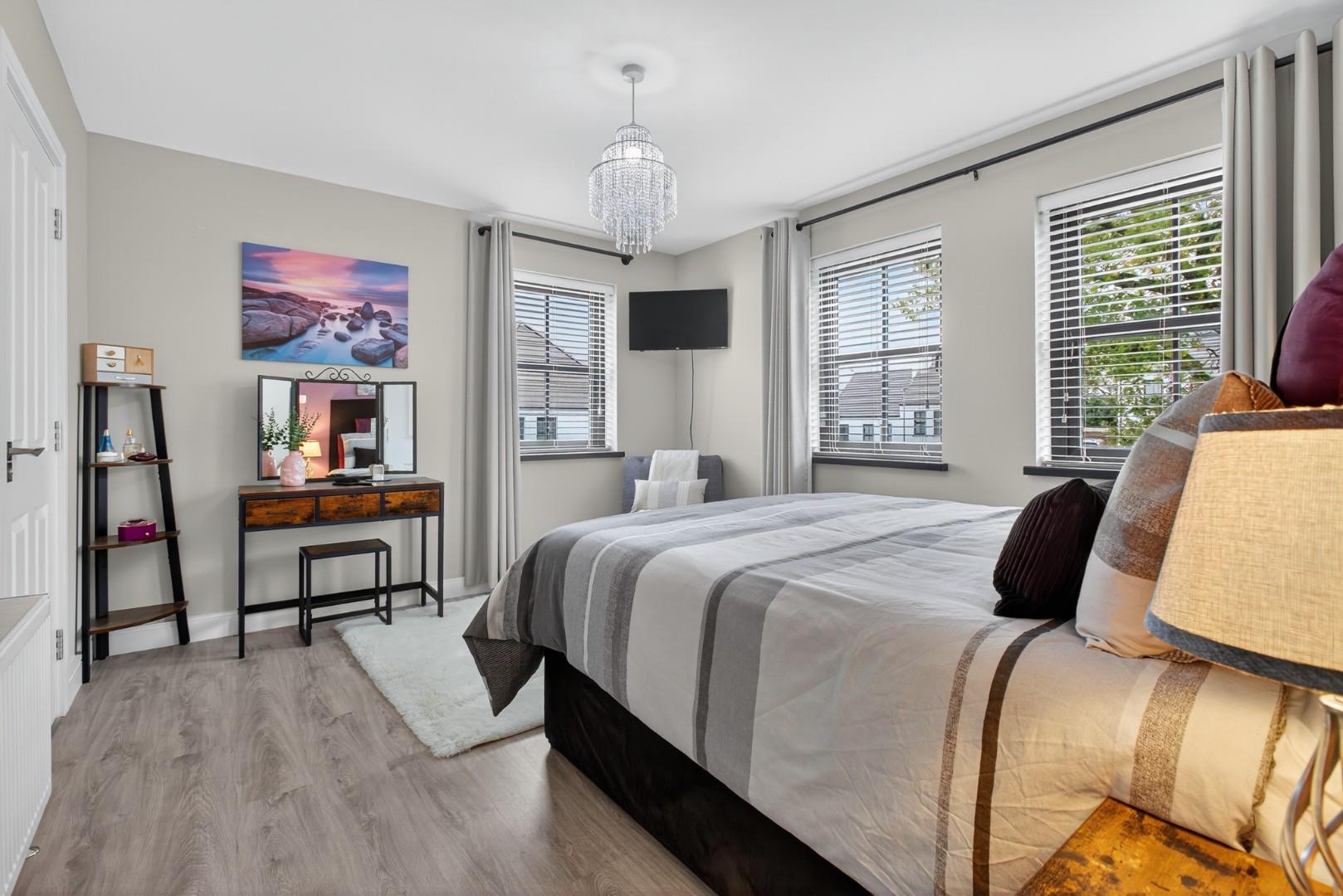 The property boasts a host of high-quality internal and external features, including a private driveway, enclosed rear garden, paved pathways, front door lighting and a modern designer kitchen. Inside, you'll find stylish tiling and wooden floors throughout, solid wood internal doors, ample storage, TV points in all bedrooms, and a contemporary media wall with an electric fire in the living room.