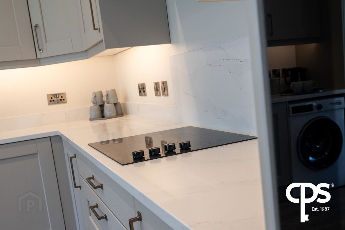 - Integrated appliances, under unit lighting and quartz worktop & upstands
