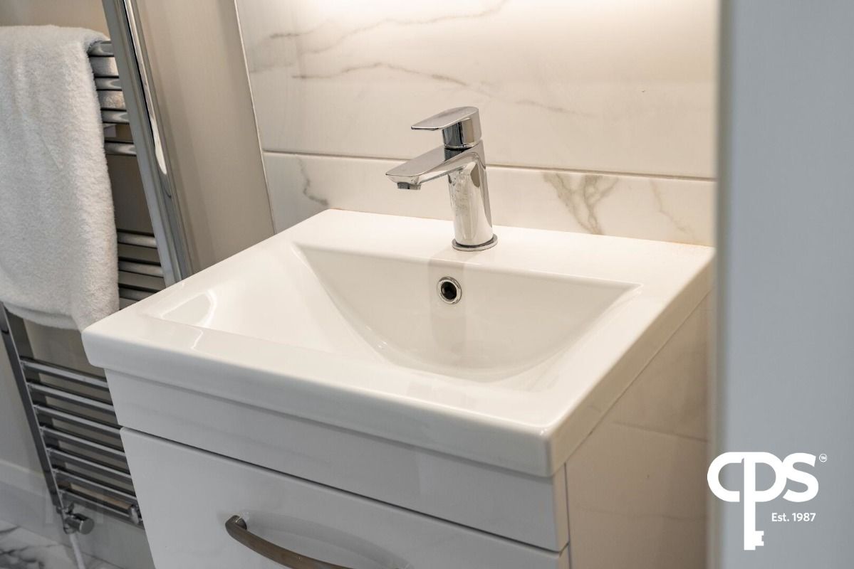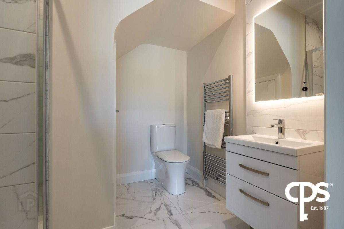 - Freestanding bath, drench head showers, wall hung vanity units, heated chrome towel rails & LED mirrors