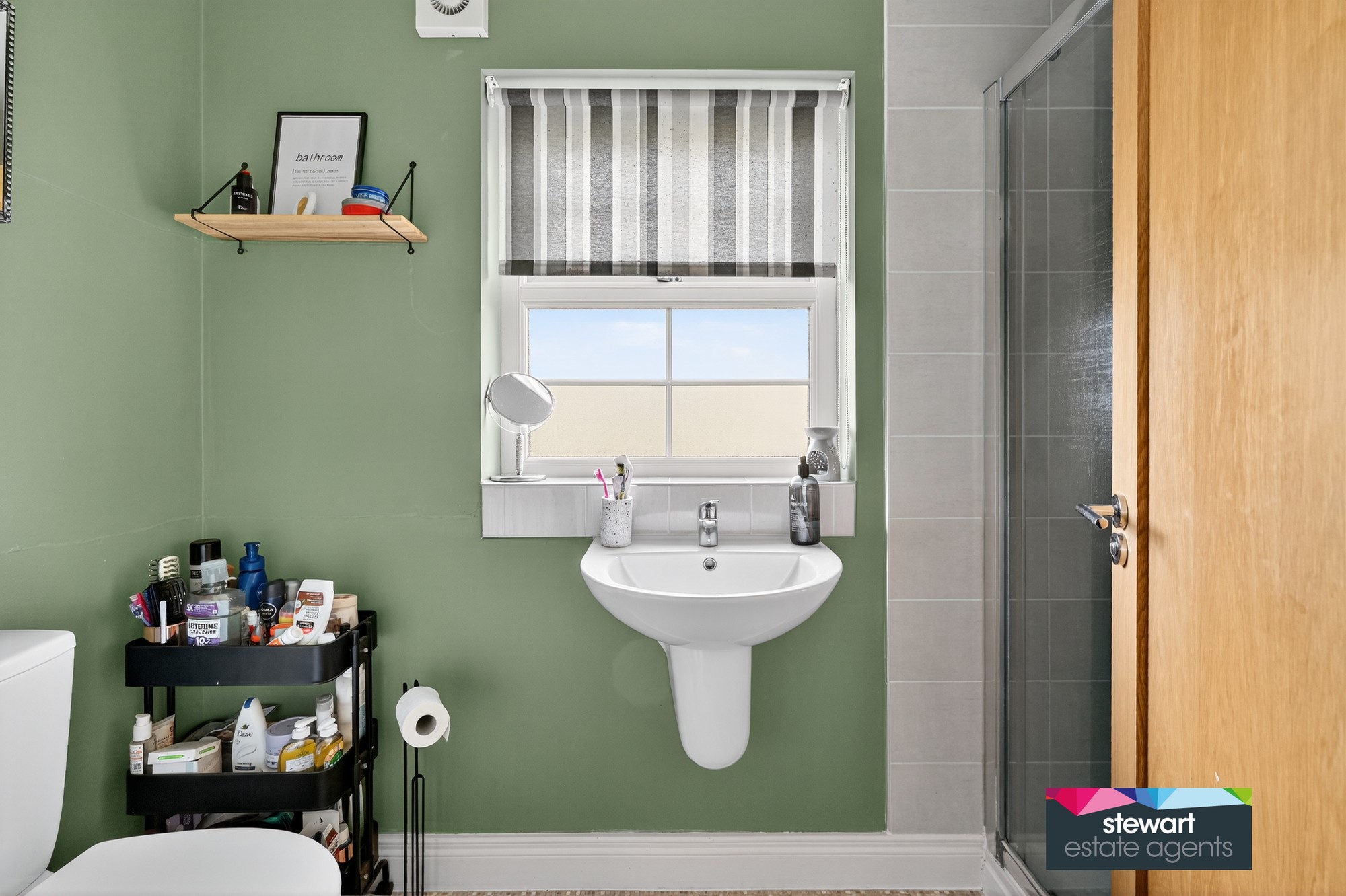 Bathroom on the first floor with a contemporary white suite comprising bath, WC and wash hand basin. Separate shower cubicle with thermostatically controlled shower fitment
