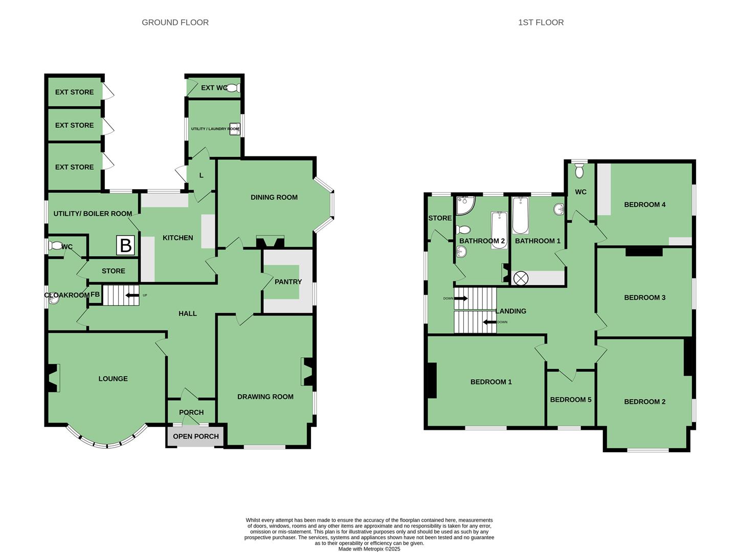 Upstairs, a generous landing leads to five well-proportioned bedrooms, two bathrooms (one with separate WC), and ample storage, providing excellent scope for family living and modernisation.
