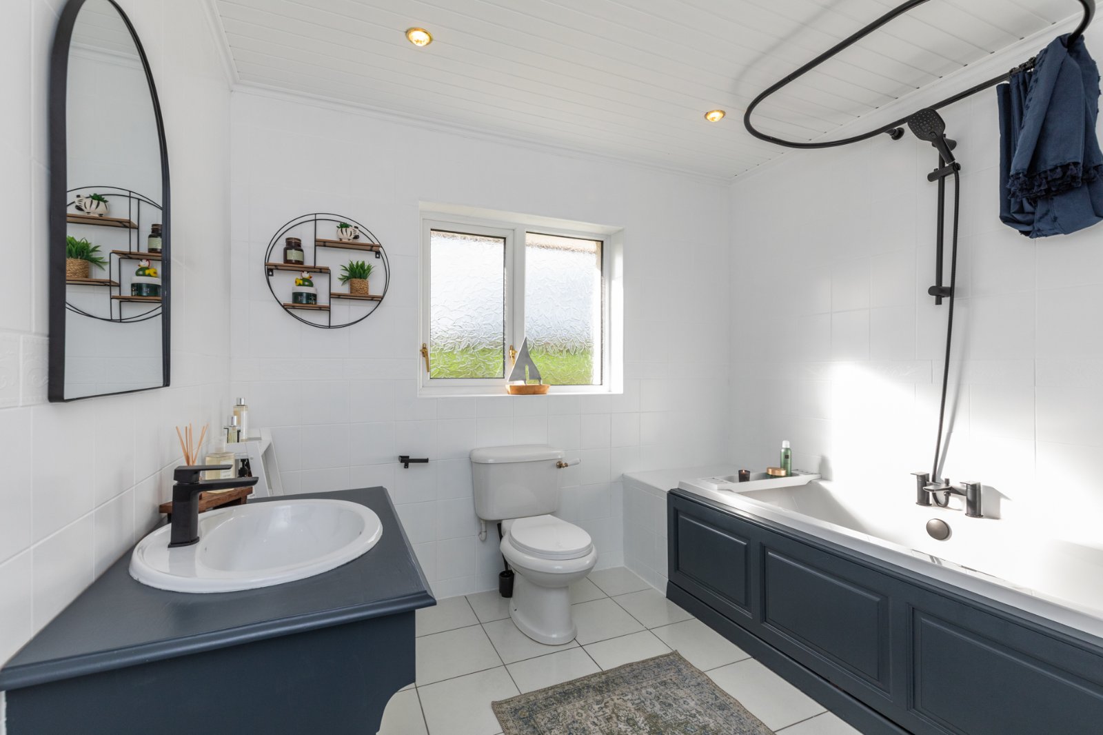 Fully tiled bathroom comprising panelled bath with mixer taps and telephone hand shower. Low flush WC. Wash hand basin in vanity unit. Tongue and groove ceiling. Recess lighting.