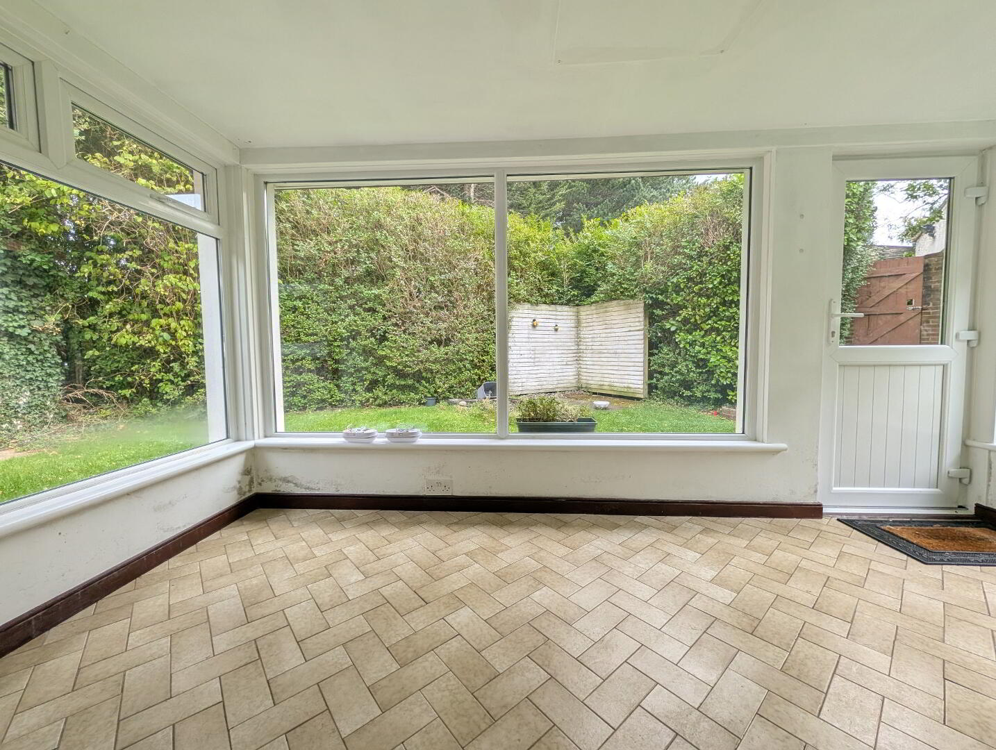 Porcelain herringbone floor tile, wall mounted downlighters, uPVC glazed door opening to gardens