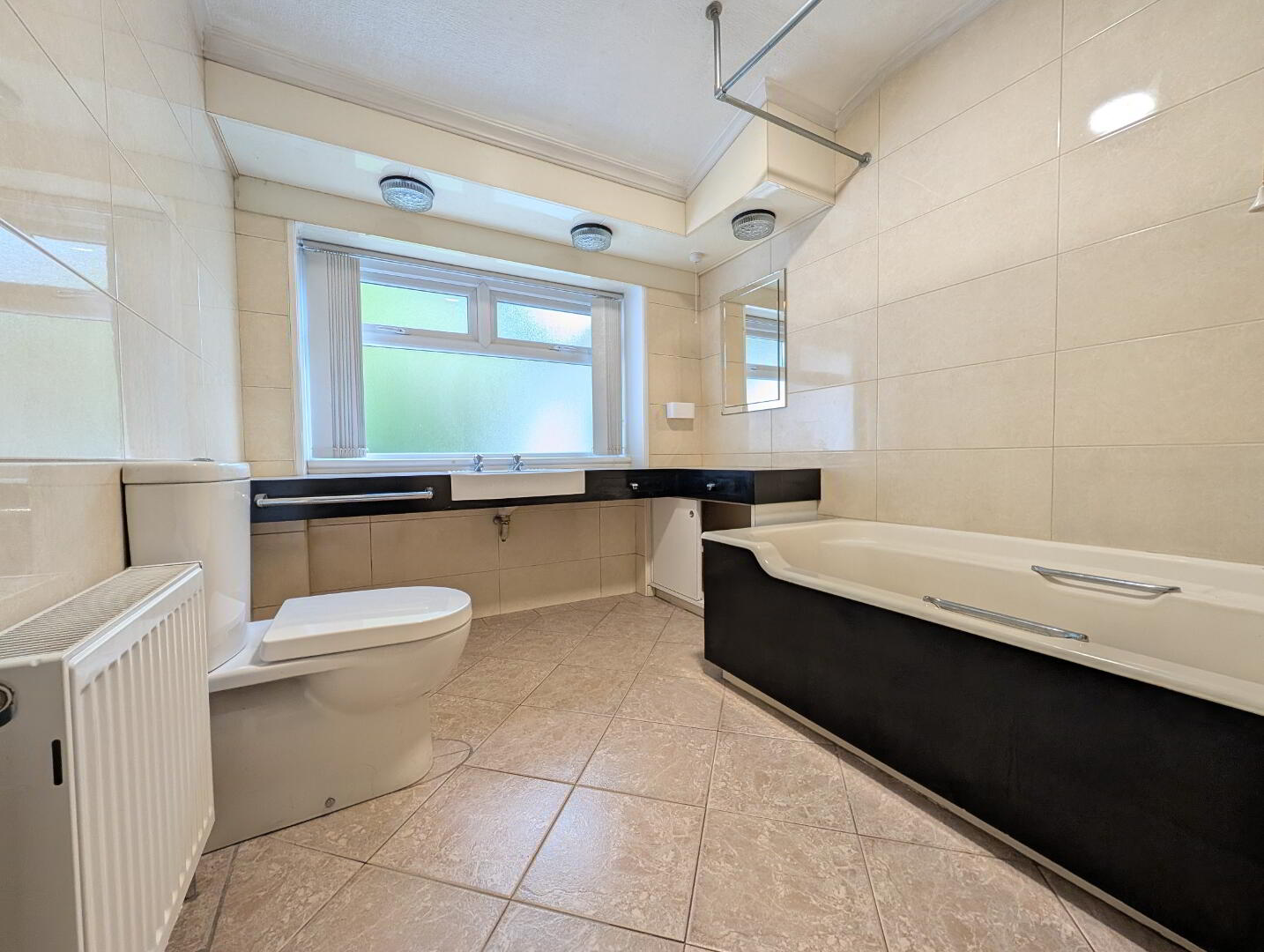 White suite comprising low flush WC, WHB & panel bath with overhead electric shower, tiled throughout