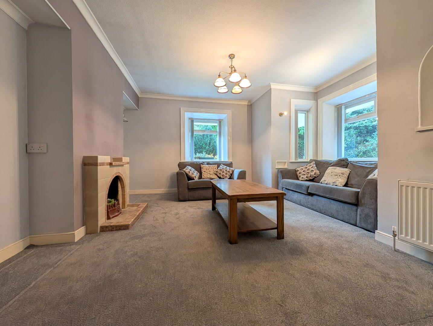 14’ 1” x 12’ 6” (4.29m x 3.82m at widest) Carpet, fireplace with tiled surround & hearth, wall mounted uplighters
