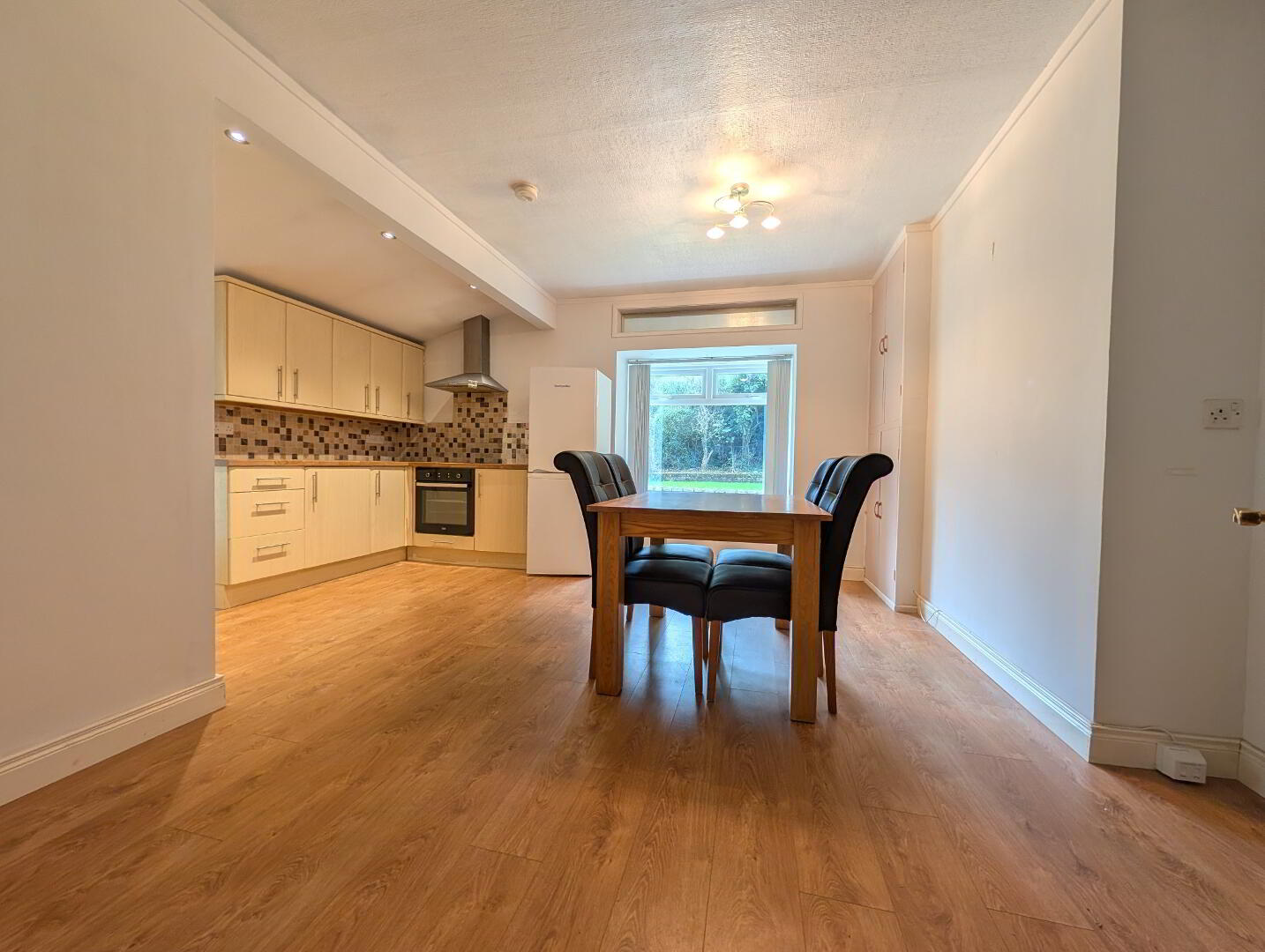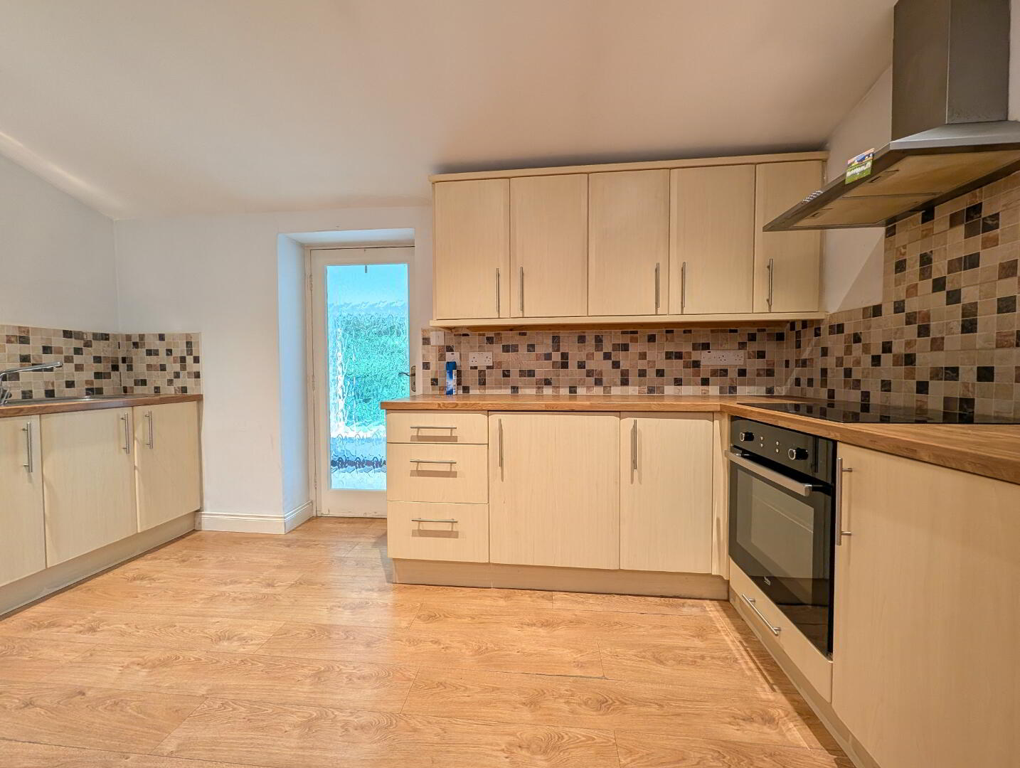 16’ 6” x 12’ 0” (5.02m x 3.67m at widest) Laminated wooden floor, range of low-level high-level kitchen units, laminated work surfaces, tile splash-back, integrated oven/grill with ceramic hob and overhead, stainless steel sink with mixer tap & drainer, recessed spotlights