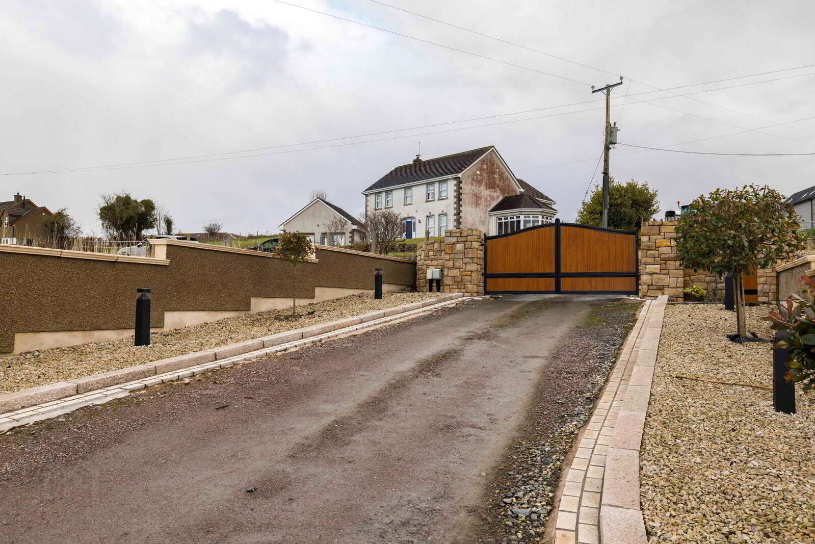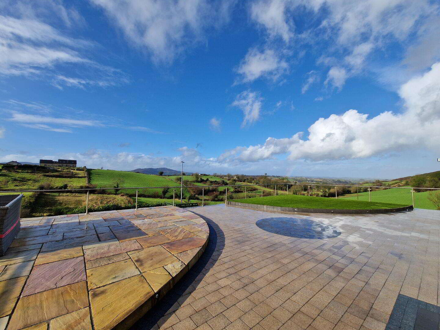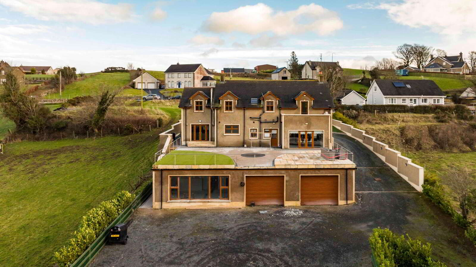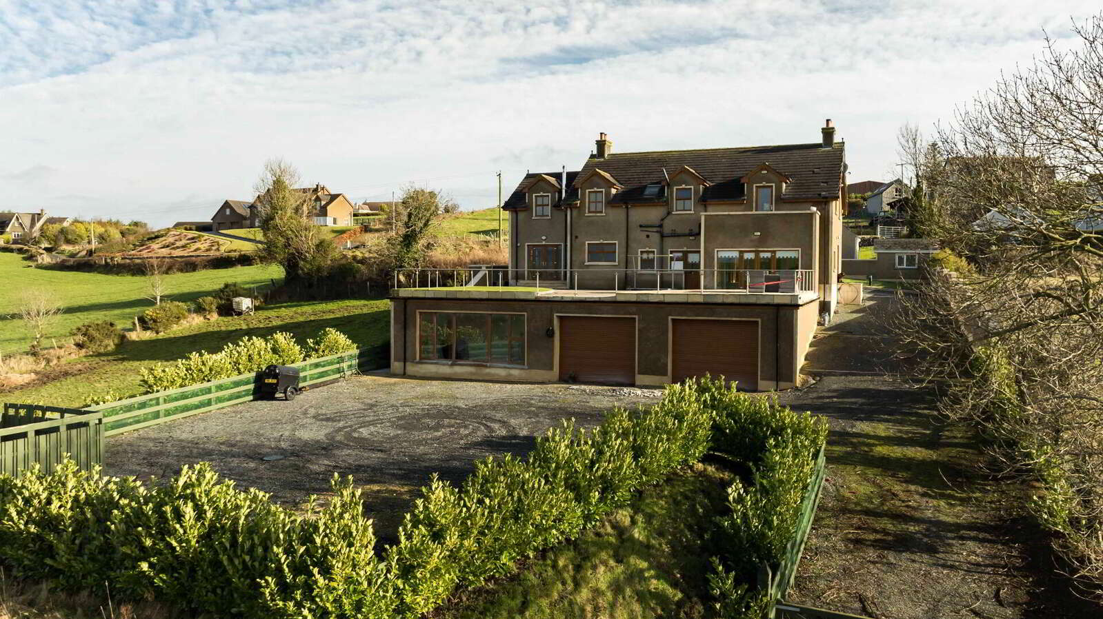 Feature stone wall and electronic entrance gates and side pedestrian gate to provide security and access to the property. Granite kerbs and raised stone beds with a variety of shrubs and plants add character to the grounds. There is an extensive rear patio area and artificial green which leads off the kitchen and reception room again finished to a high standard of specification with stylish chrome railings to maximise the superb panoramic view from this elevated position. The rear garden is therefore a perfect setting for relaxation and enjoyment. The driveway which leads down to the lower tiered yard and double garage and basement area provides easy access, excellent parking and turn space for larger vehicles, ideal for