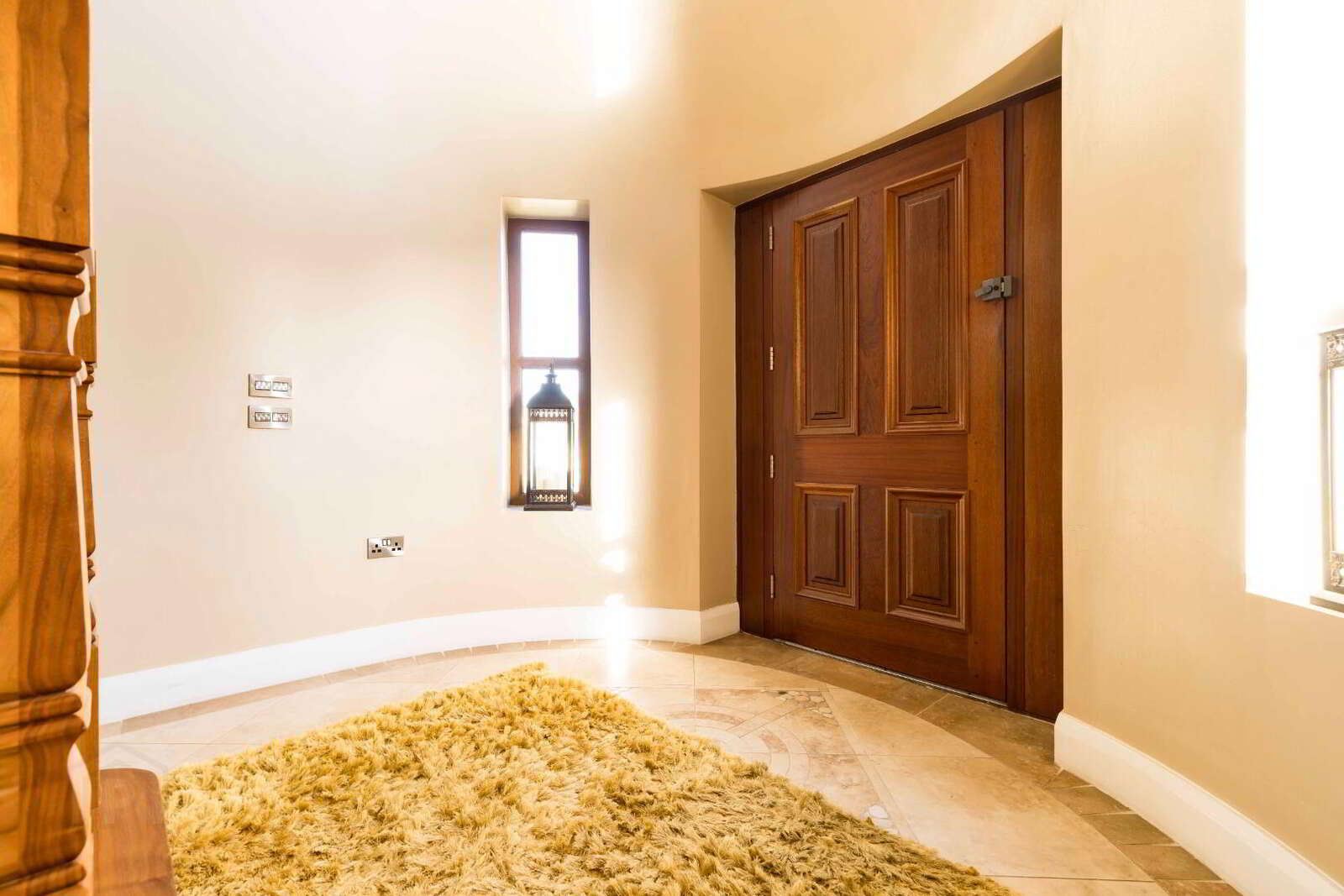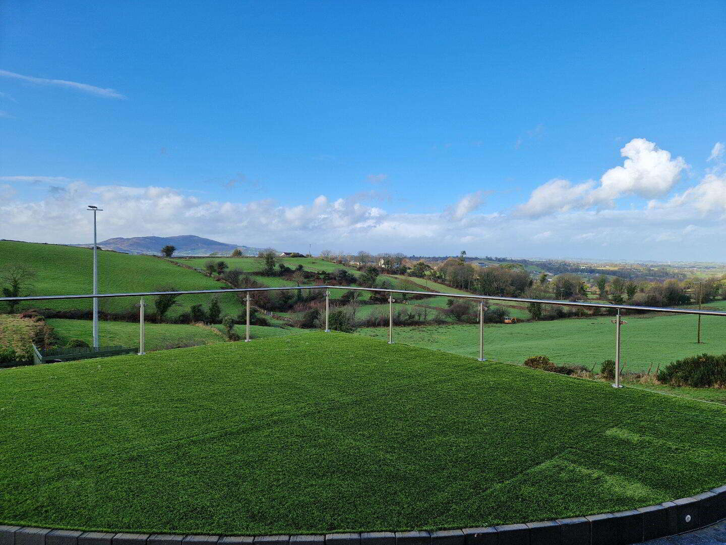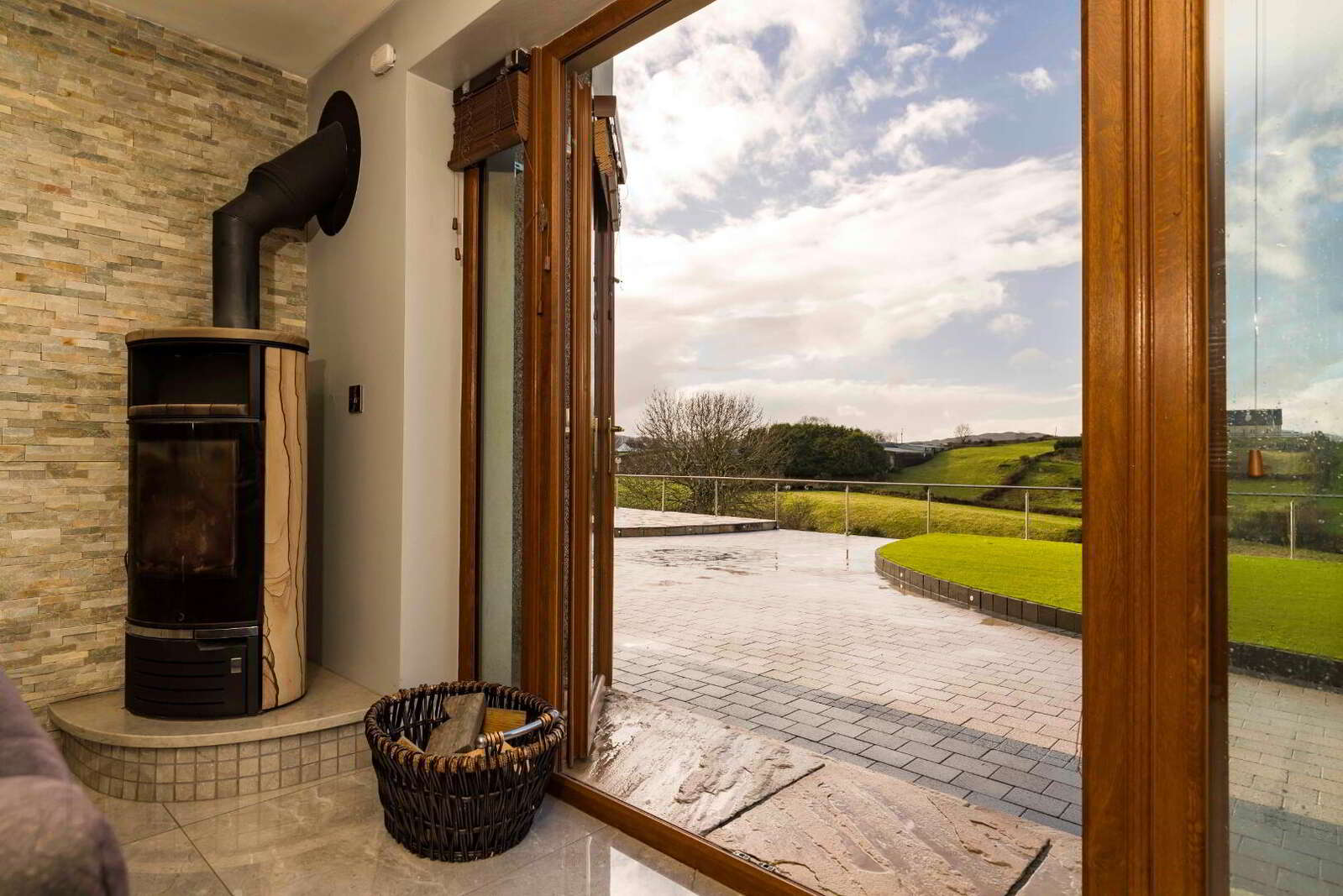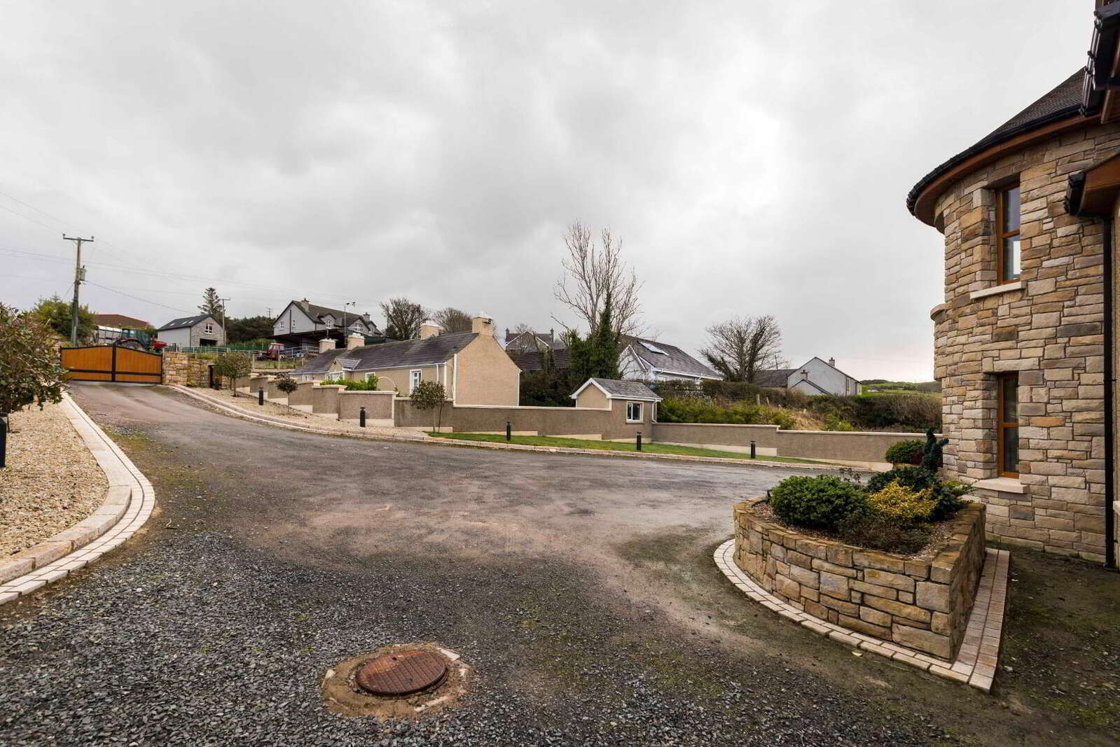 Feature stone wall and electronic entrance gates and side pedestrian gate to provide security and access to the property. Granite kerbs and raised stone beds with a variety of shrubs and plants add character to the grounds. There is an extensive rear patio area and artificial green which leads off the kitchen and reception room again finished to a high standard of specification with stylish chrome railings to maximise the superb panoramic view from this elevated position. The rear garden is therefore a perfect setting for relaxation and enjoyment. The driveway which leads down to the lower tiered yard and double garage and basement area provides easy access, excellent parking and turn space for larger vehicles, ideal for