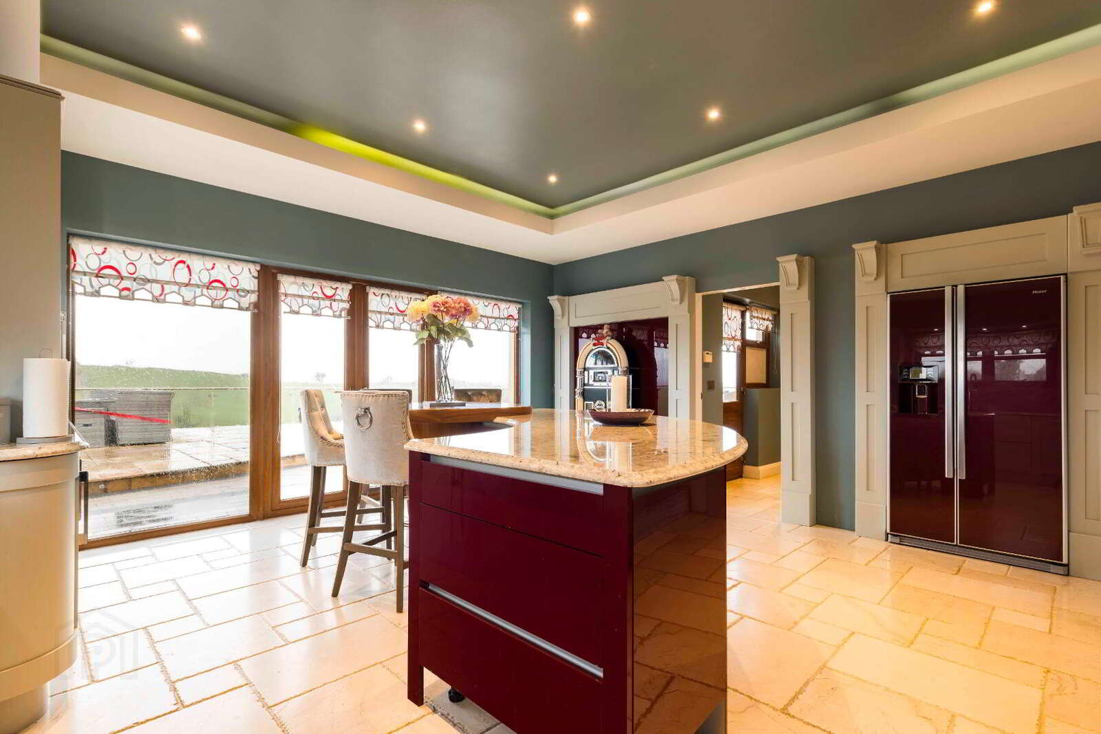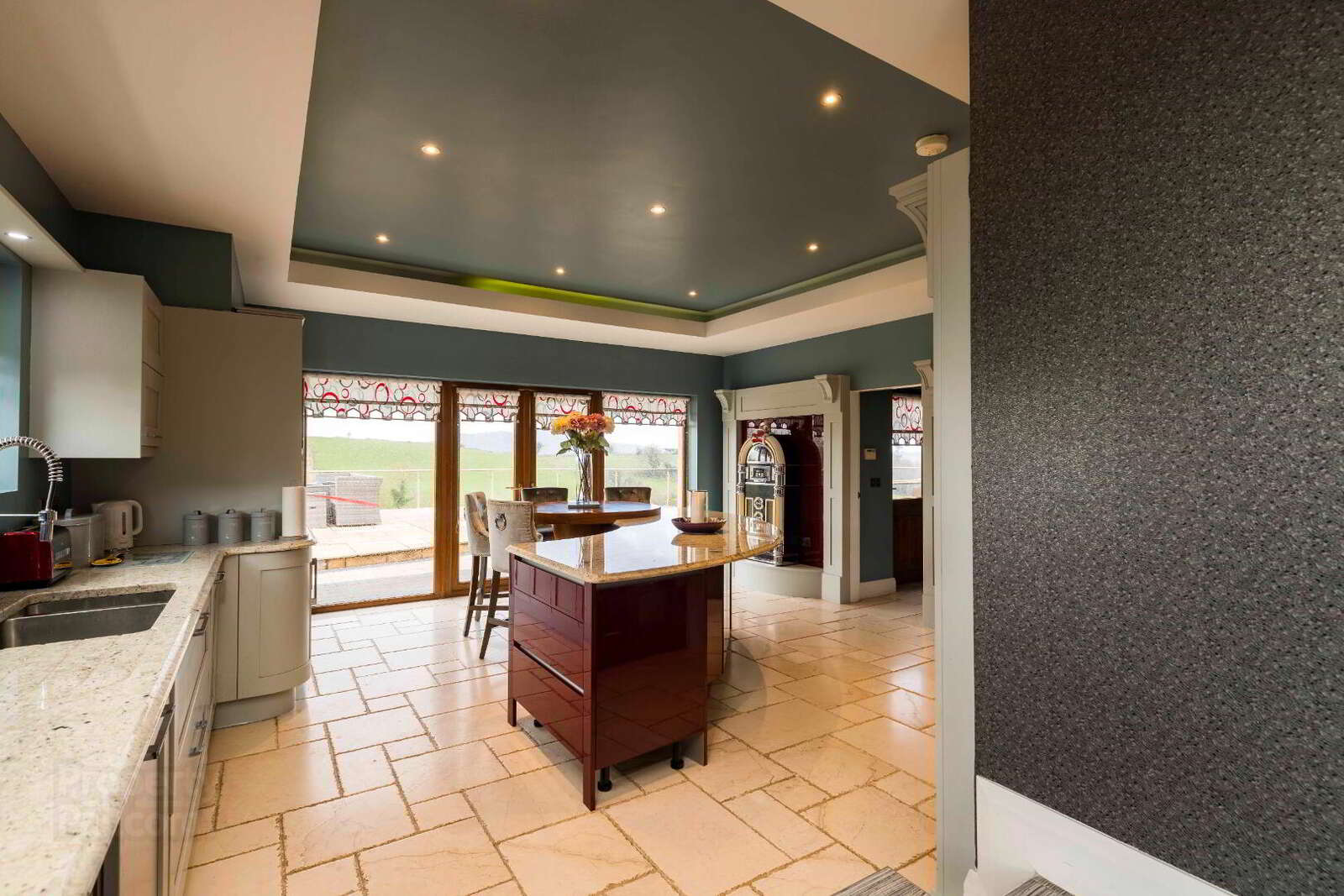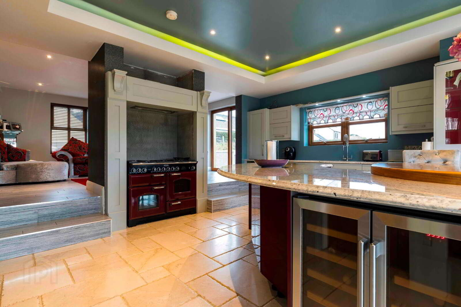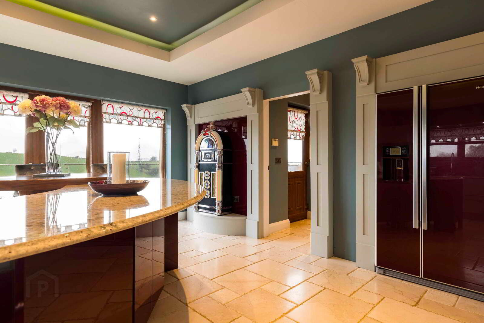 fridge/freezer included in the specification. Polished porcelain tiled floor. Feature ceiling with high centre piece, ambient LED lighting and spot lighting. Sliding patio doors leading to rear patio and garden. Door to utility room. Heat detector. TV pt. Room thermostat for underfloor heating. Juke box not included. Rear view aspect.