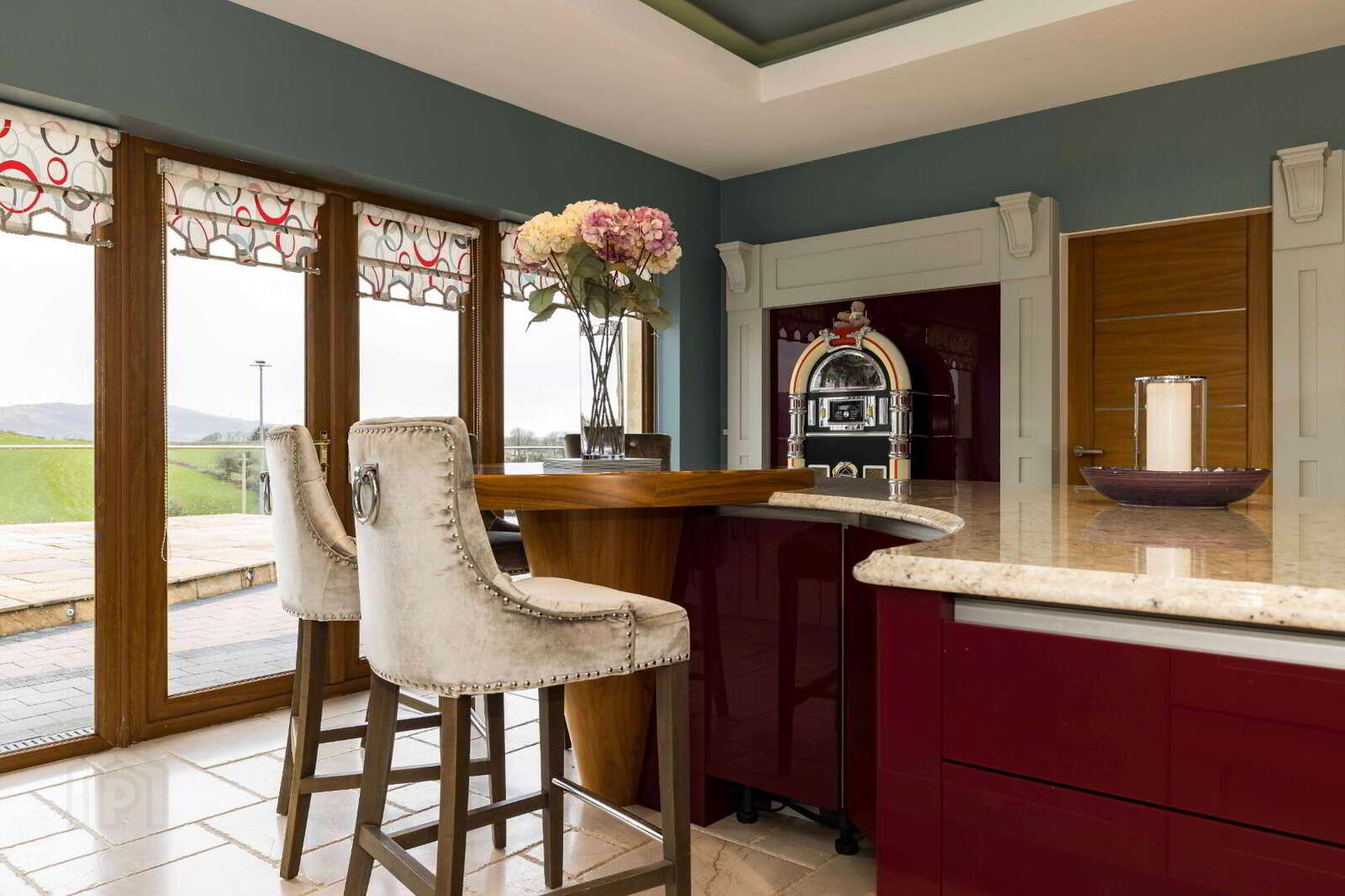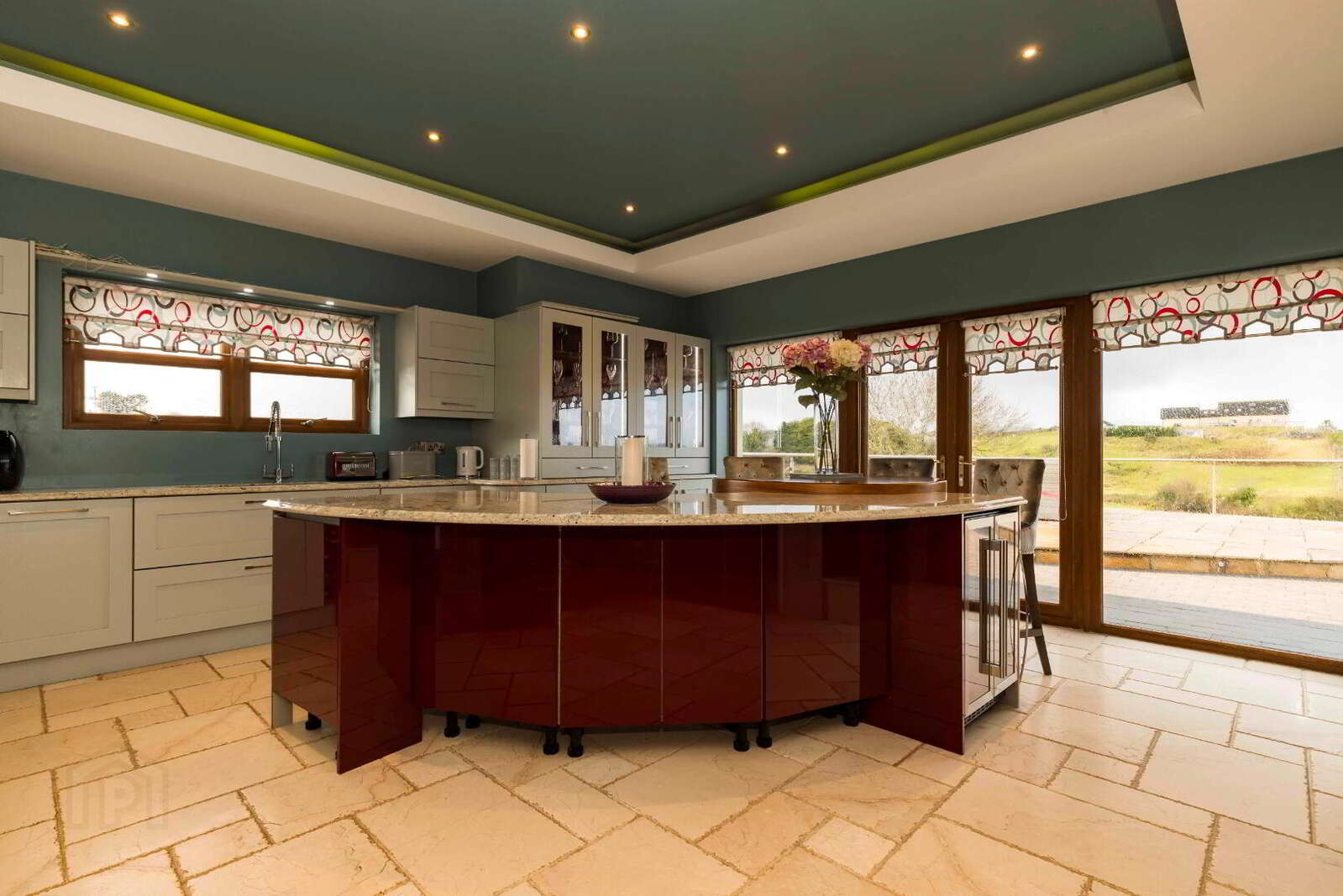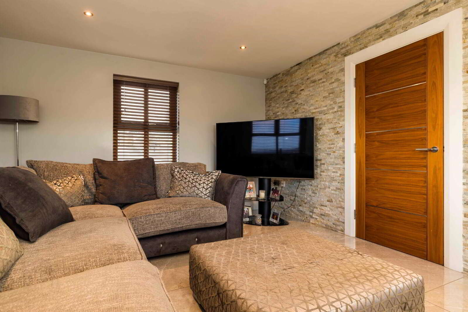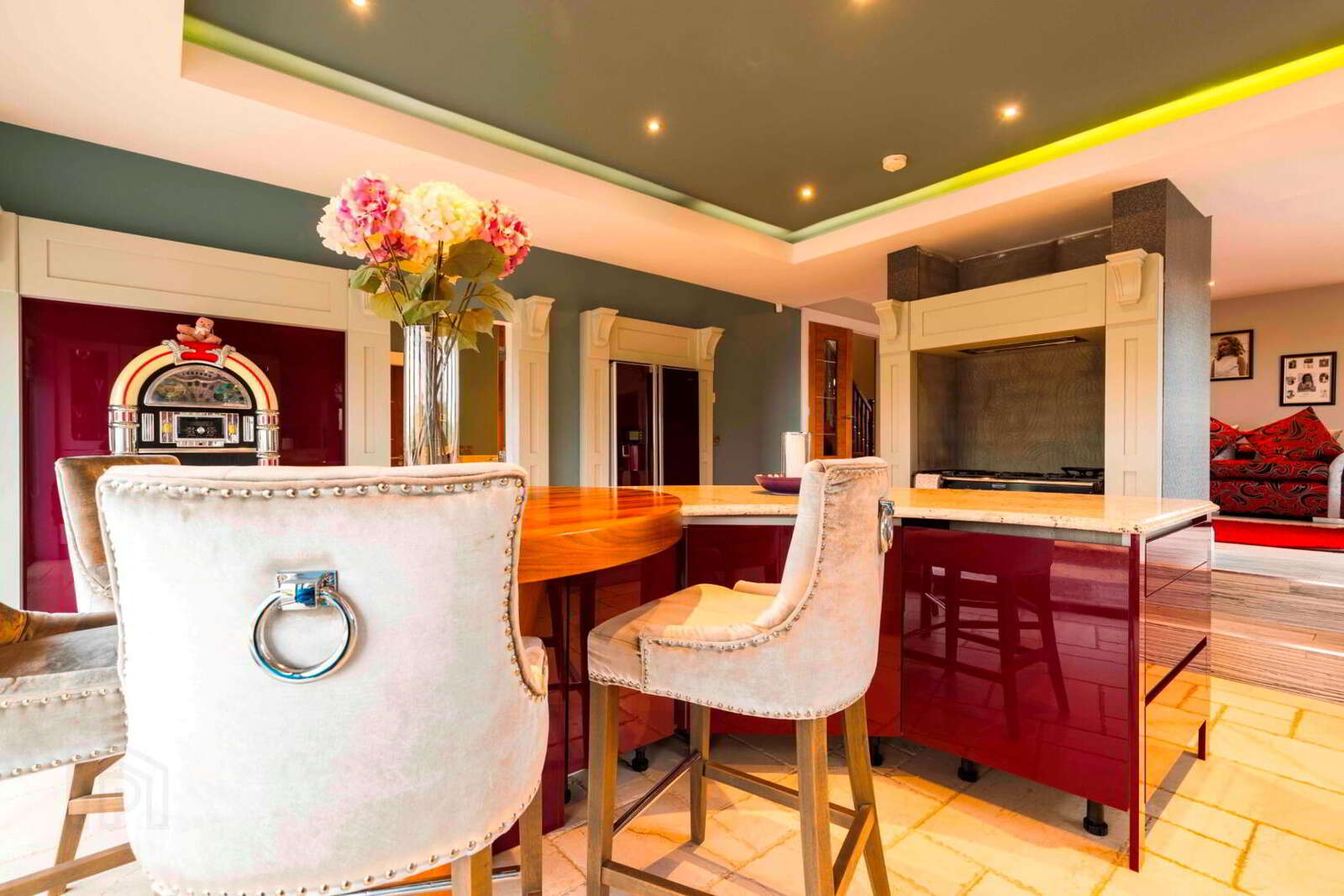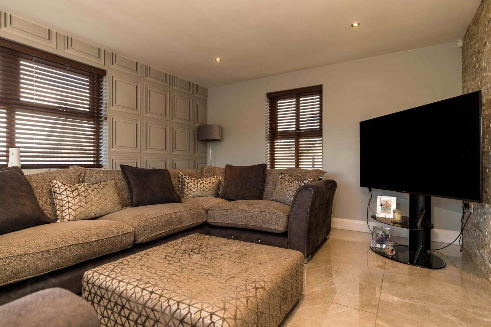fridge/freezer included in the specification. Polished porcelain tiled floor. Feature ceiling with high centre piece, ambient LED lighting and spot lighting. Sliding patio doors leading to rear patio and garden. Door to utility room. Heat detector. TV pt. Room thermostat for underfloor heating. Juke box not included. Rear view aspect.