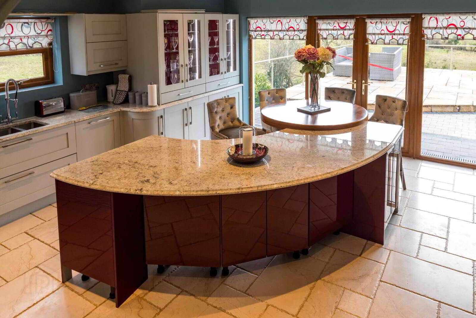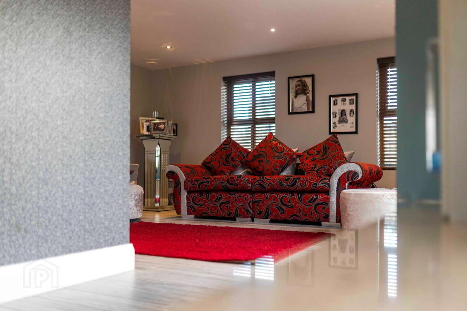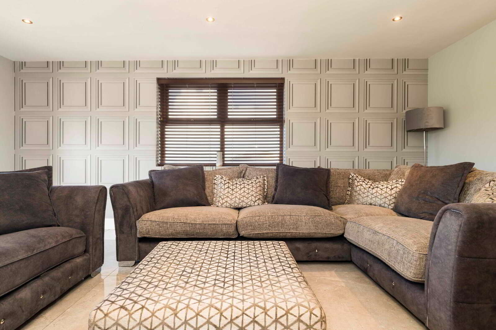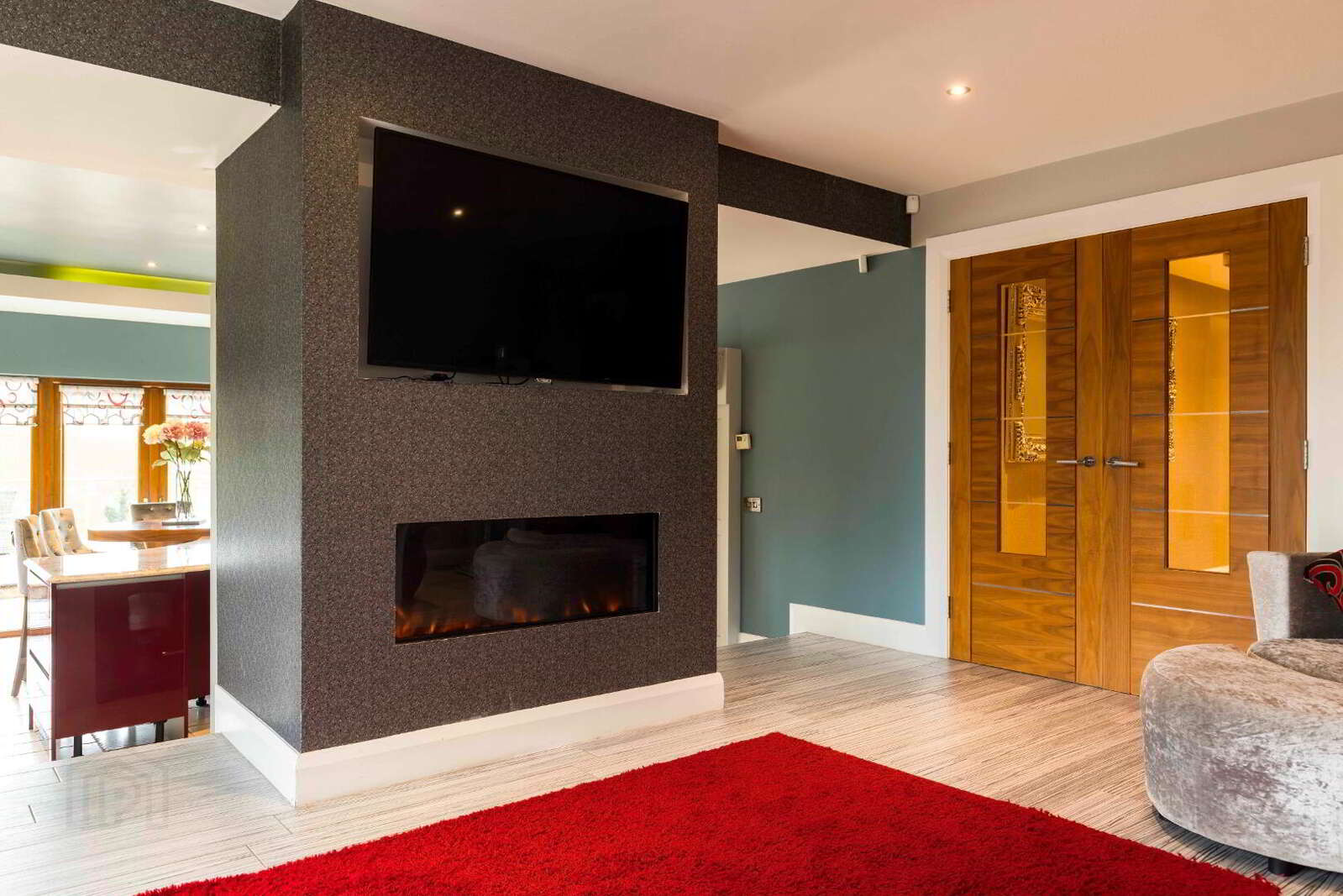 fridge/freezer included in the specification. Polished porcelain tiled floor. Feature ceiling with high centre piece, ambient LED lighting and spot lighting. Sliding patio doors leading to rear patio and garden. Door to utility room. Heat detector. TV pt. Room thermostat for underfloor heating. Juke box not included. Rear view aspect.