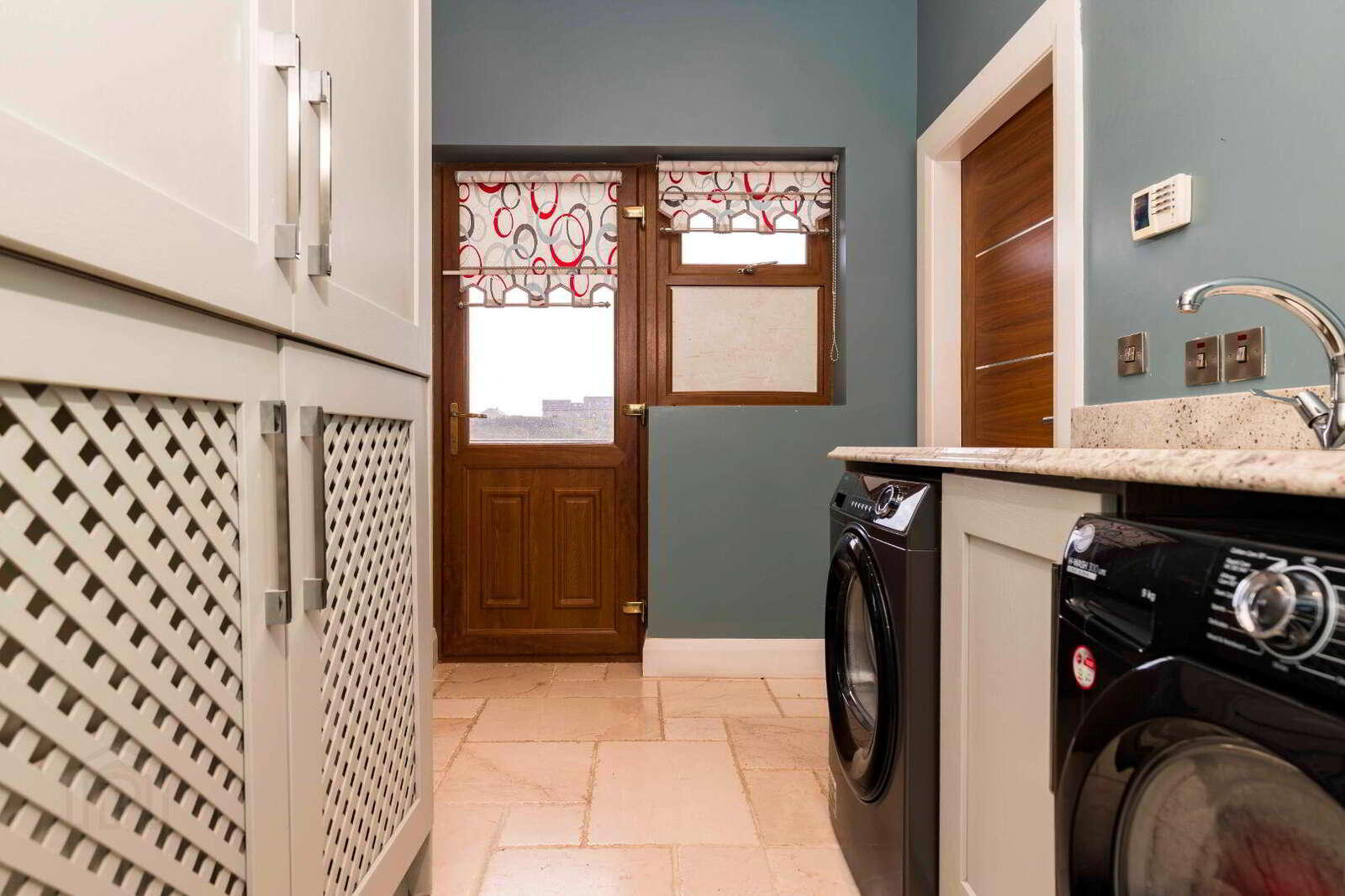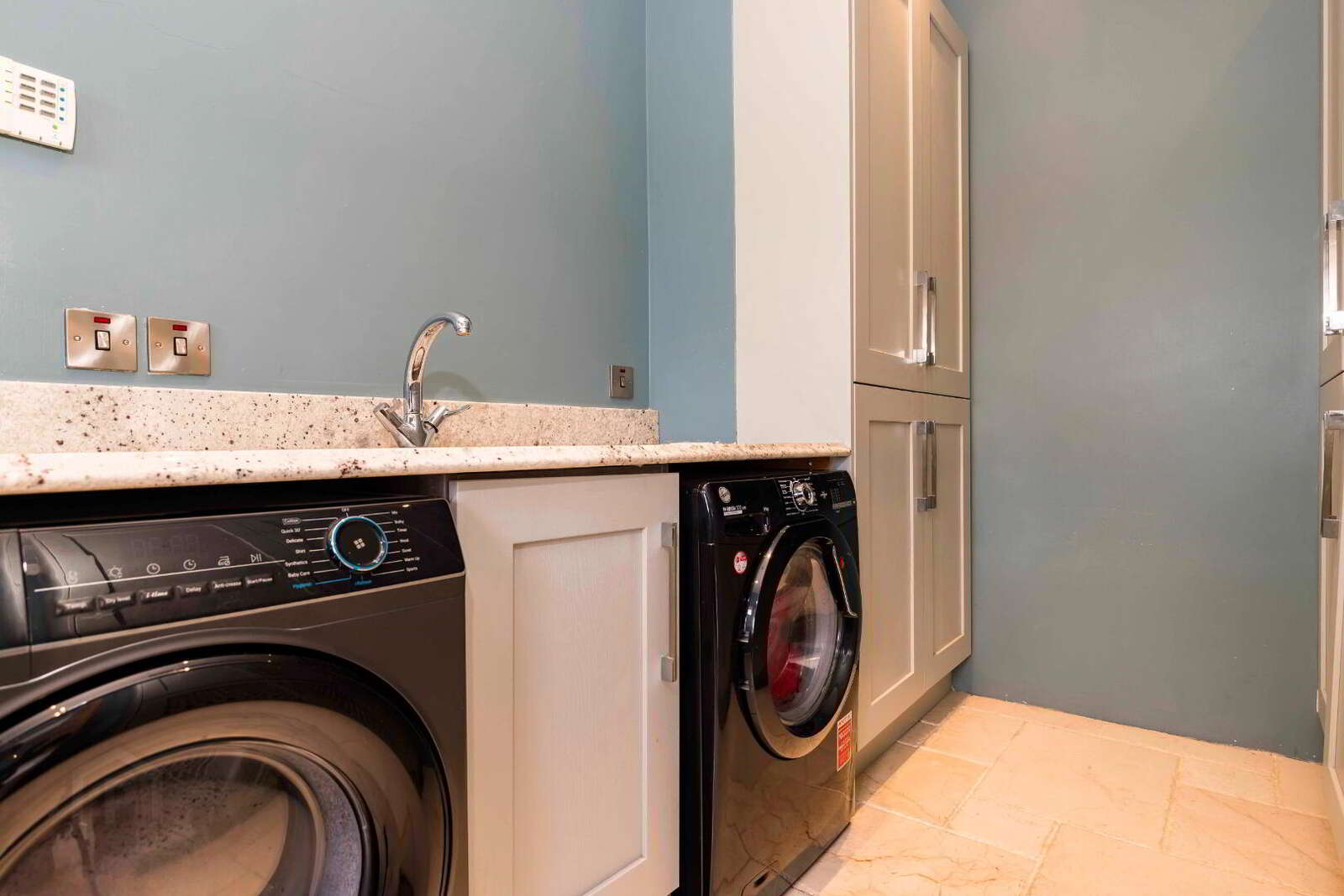 3.89m x 2.53m Fitted high and low level units with stainless steel sink. Quartz worktop, Plumbed for washing machine. Housing for tumble dryer. uPVC glazed rear exit door. Rear window. Porcelain tiled floor. Part tiled walls. Spot lighting. Fan. Digital heating control (dual heat and water function). Security alarm key pad.