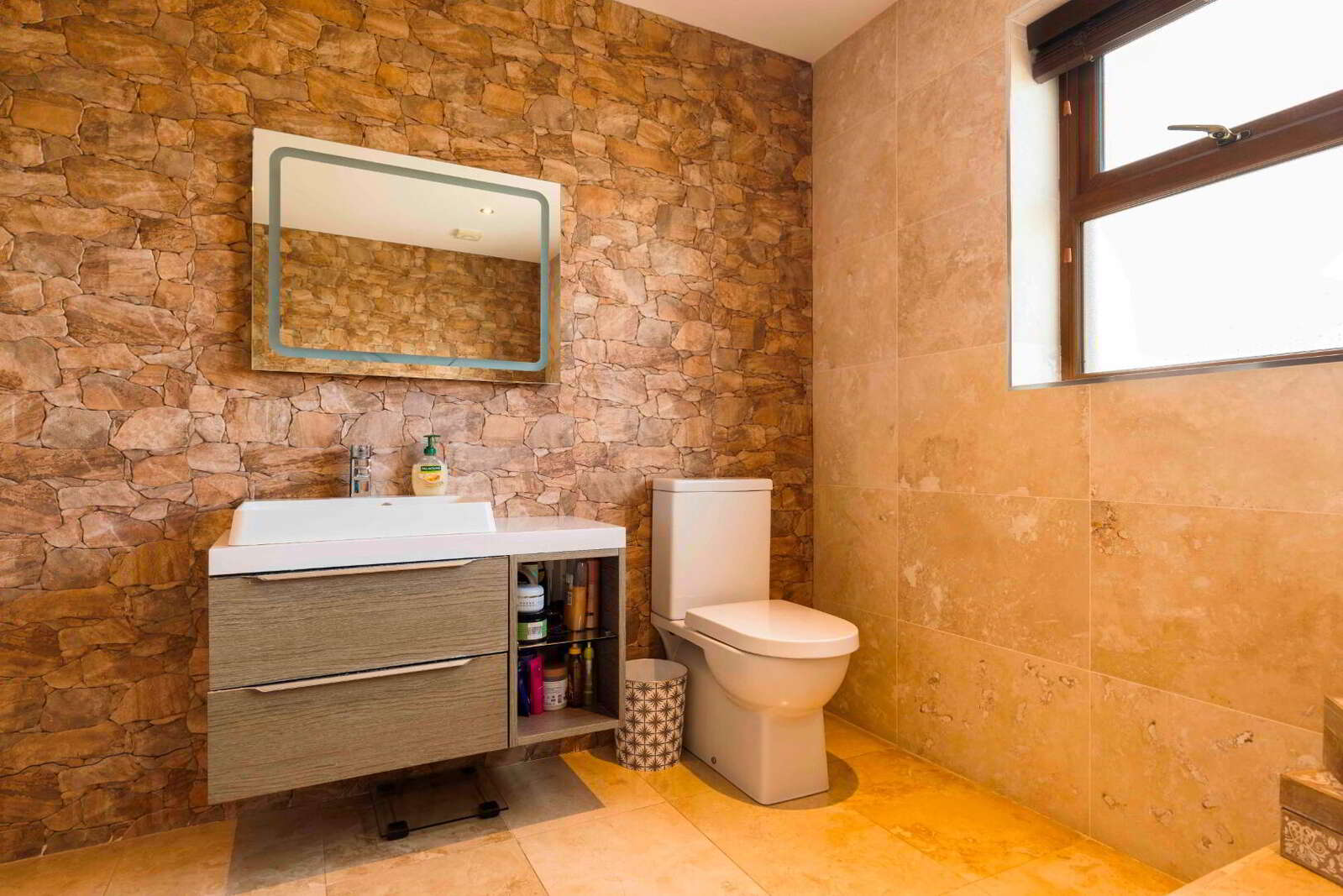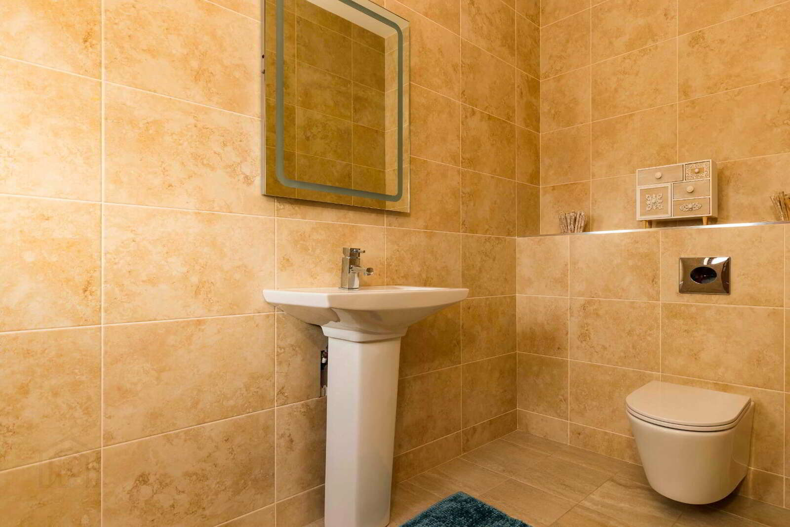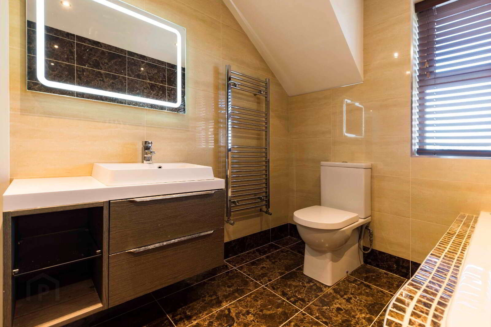 2.79m x 1.55m Stylish white suite with wash hand basin, low pan WC. Polished porcelain tiled floor and tiled walls. Chrome heated towel rail. Wall mirror with lighting. Spot lighting. Fan. Rear aspect.