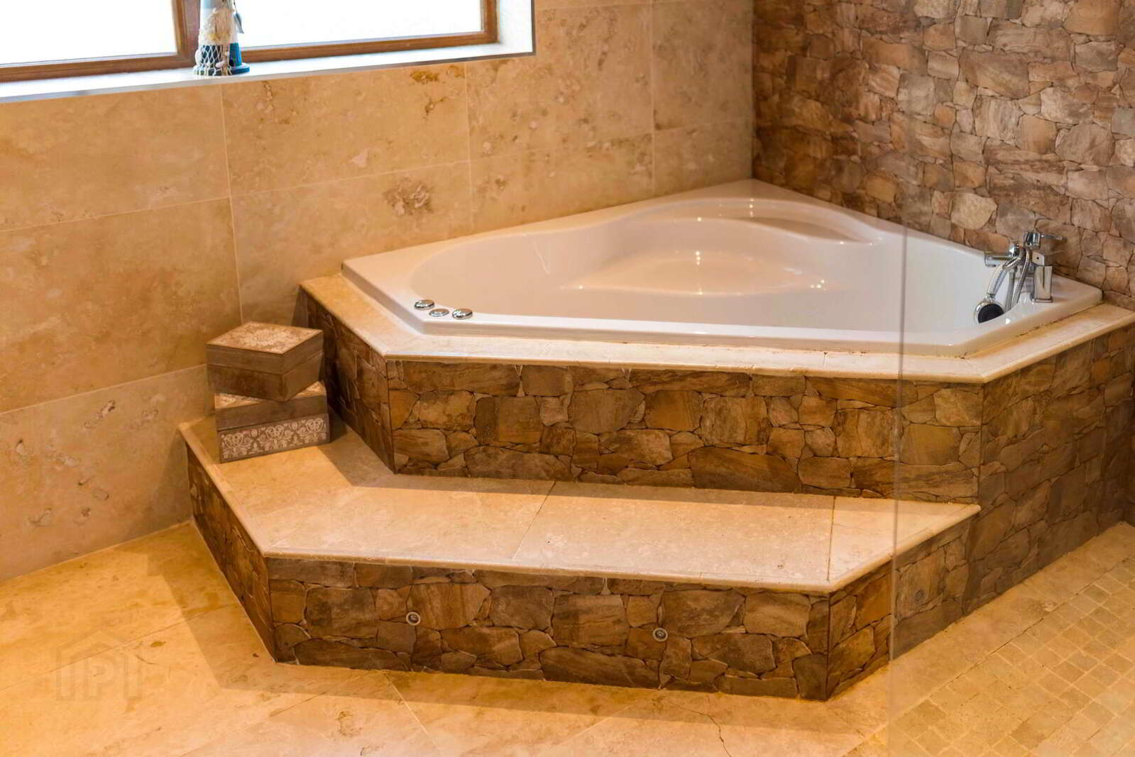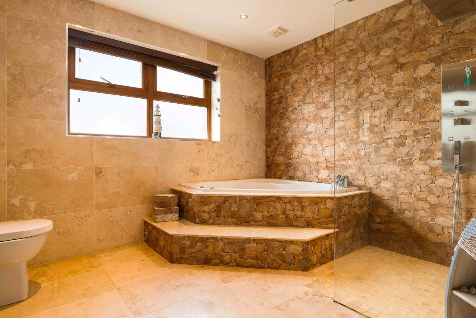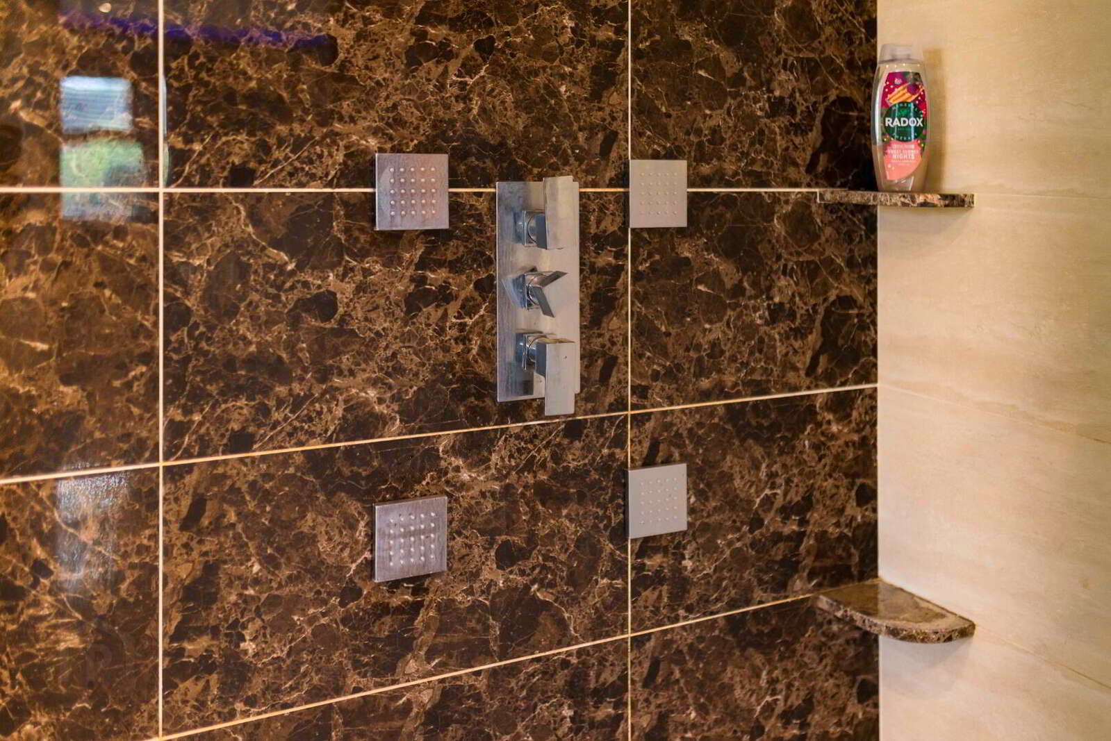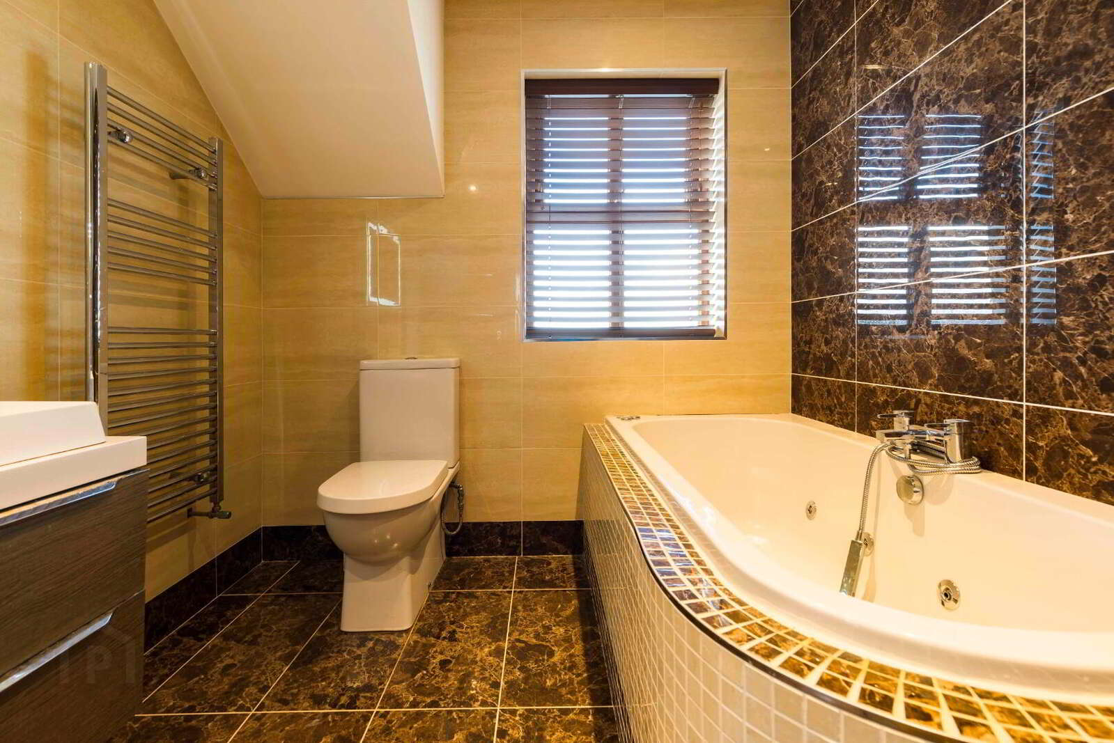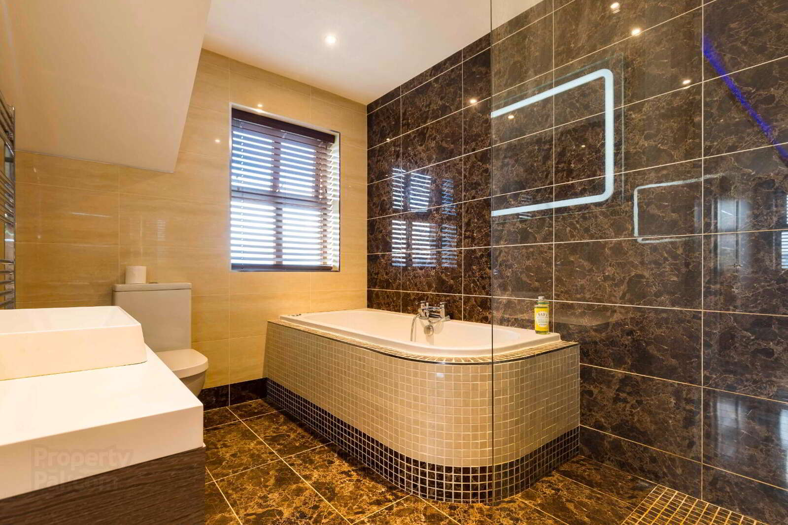 3.27m x 2.79m Luxury white bathroom suite comprises, raised corner bath with water jet system, chrome mixer taps and shower head; a walk-in tray-less shower area with glass shower screen, chrome thermostatic shower fittings; wash hand basin with vanity unit; and WC (dual flush). Porcelain tiled walls and marble tiled floor. Chrome heated towel rail. Spot lighting. Wall mirror with LED lighting. Fan. Rear aspect.