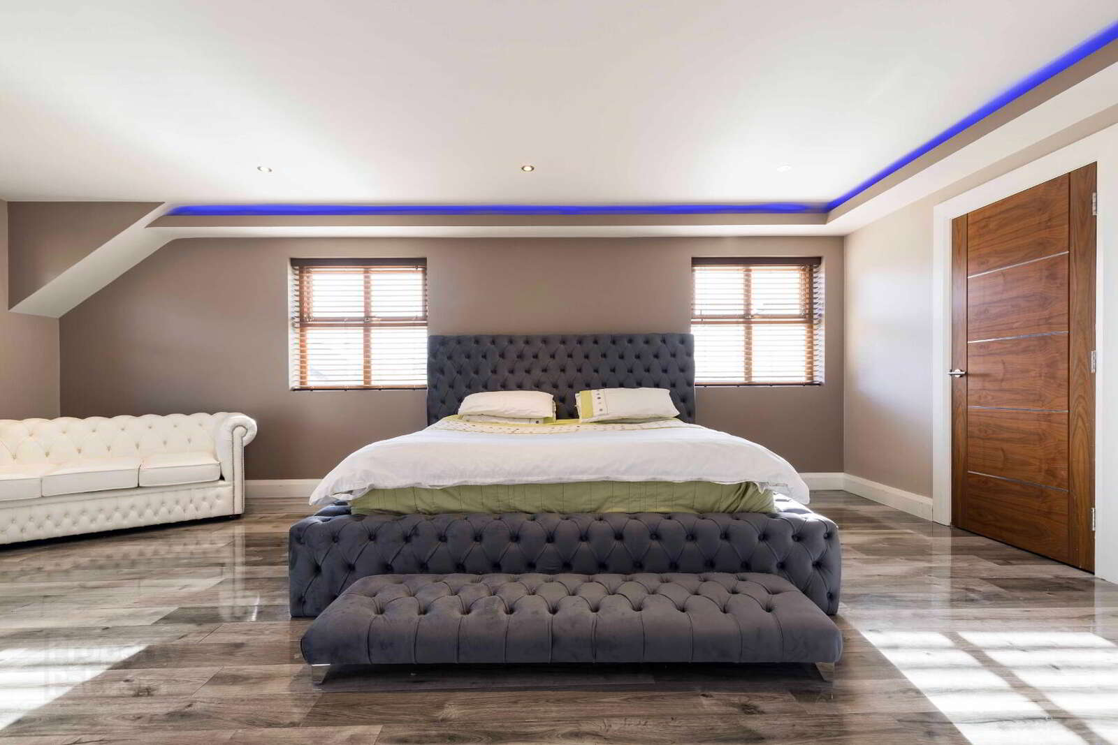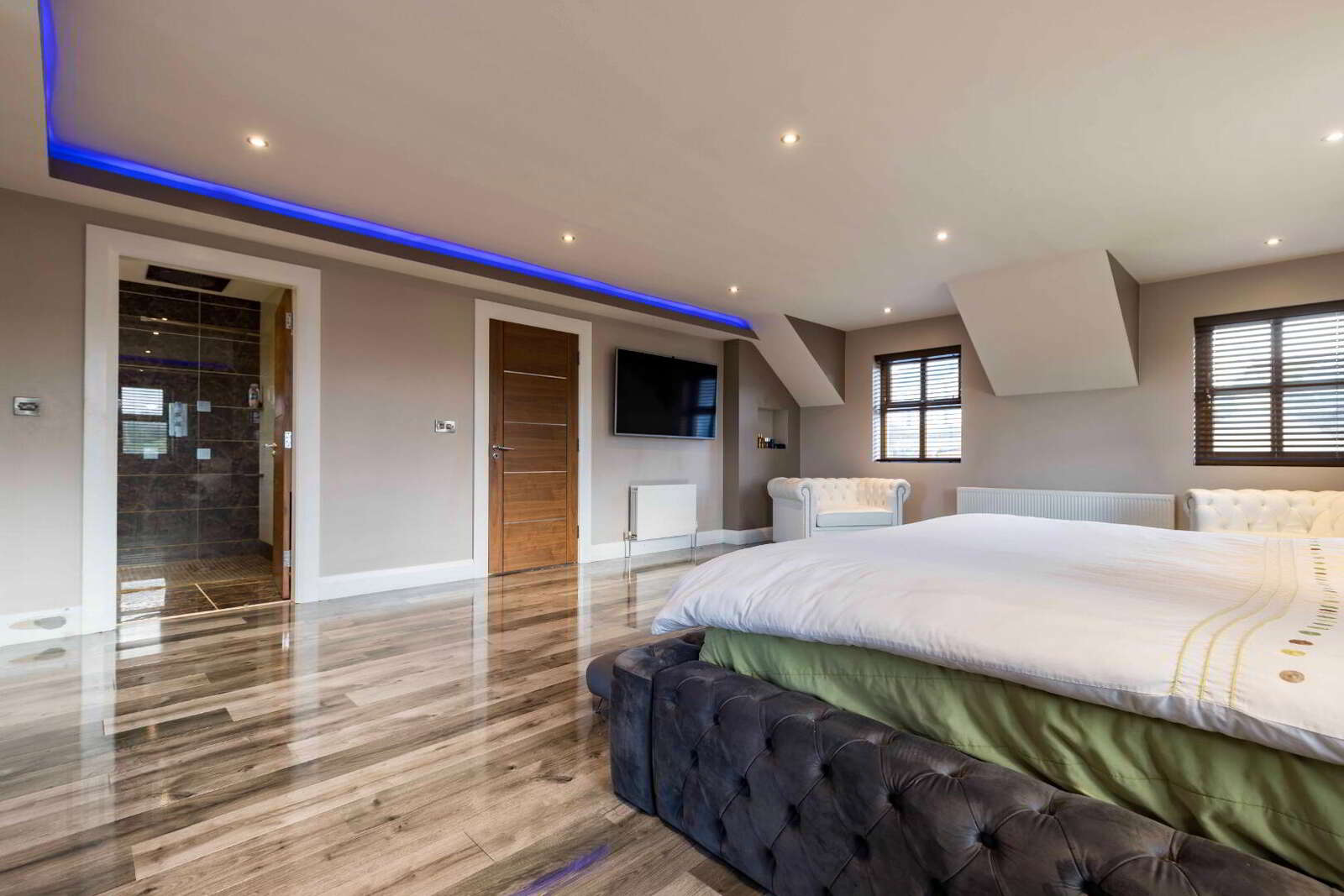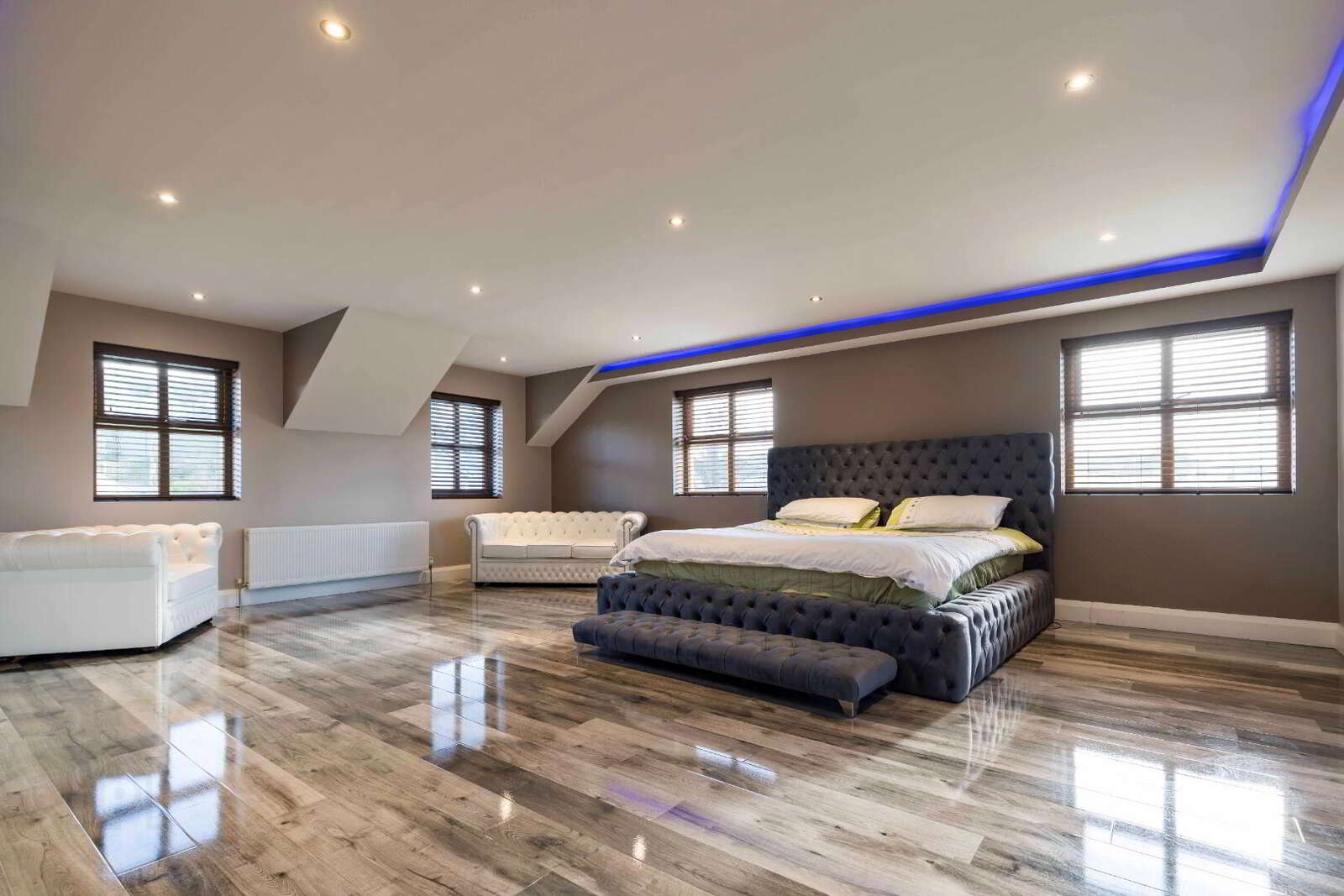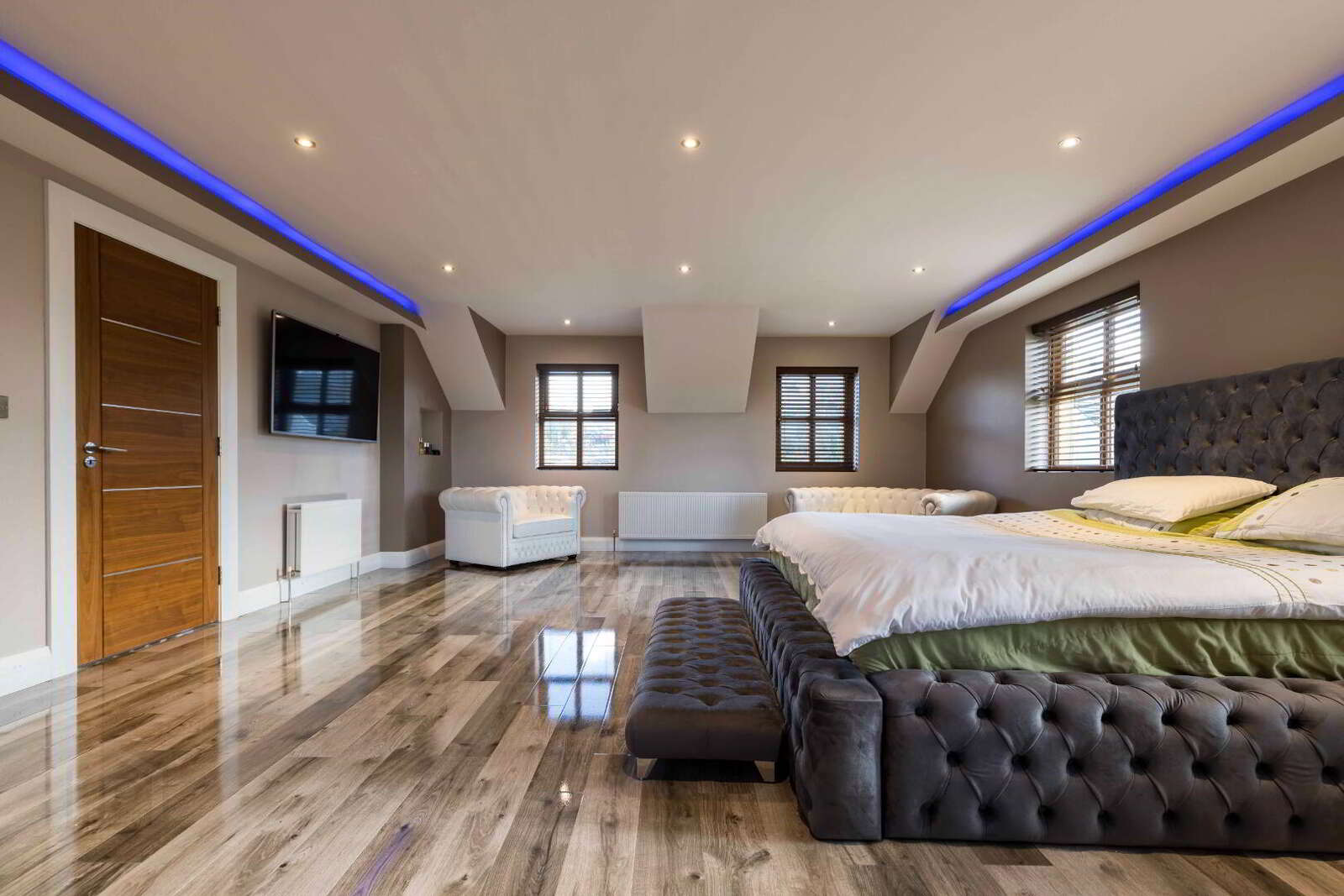 5.66m x 3.75m Spacious double bedroom. Feature dormer windows and gable window. TV pt. Grey gloss laminated wooden flooring. Spot lighting. Triple aspect. Panoramic view.
