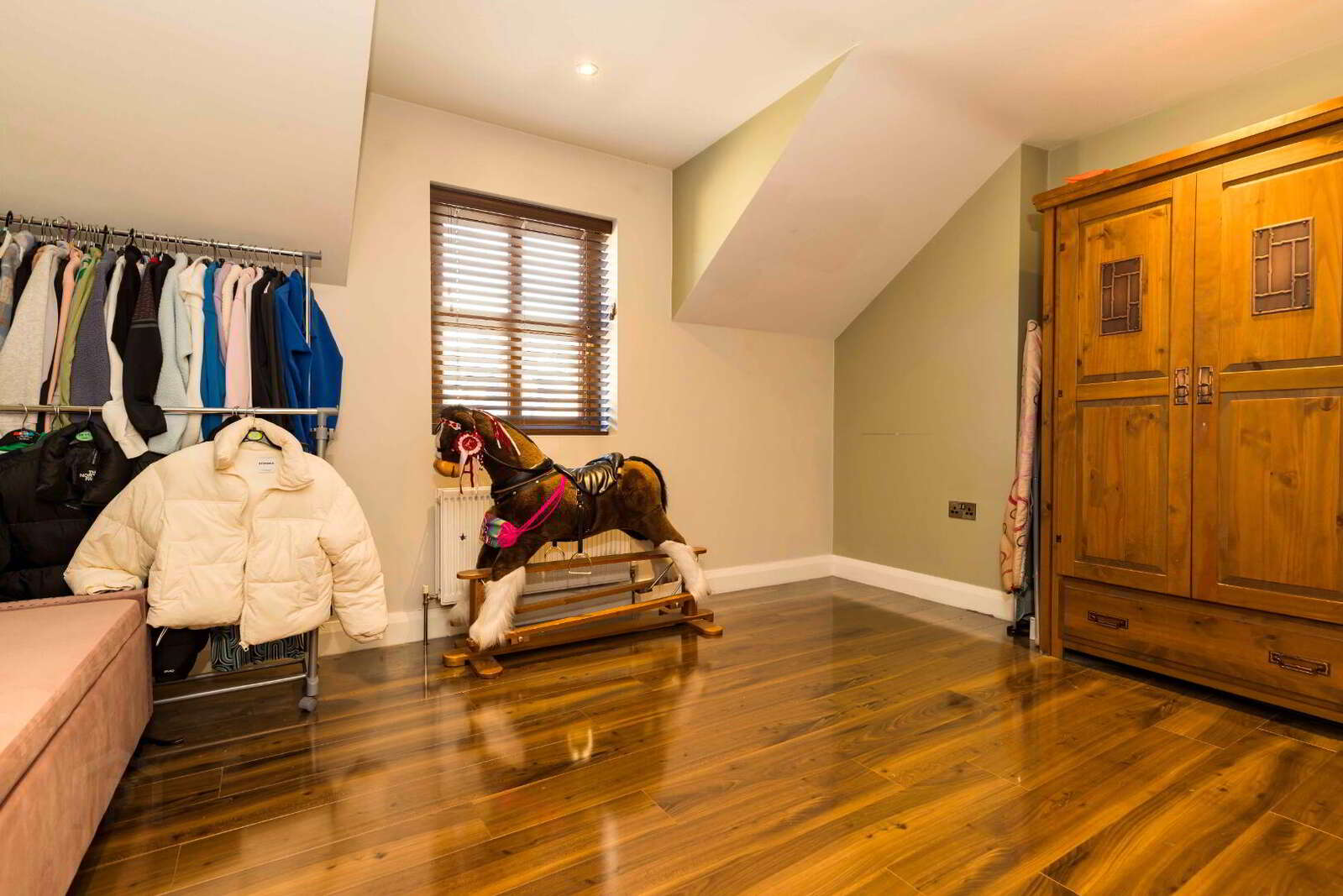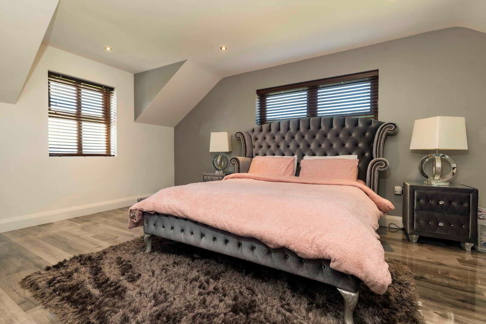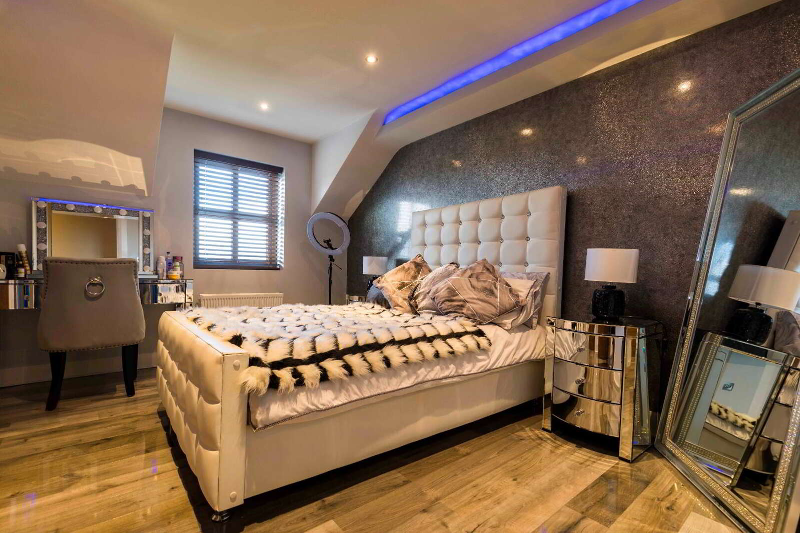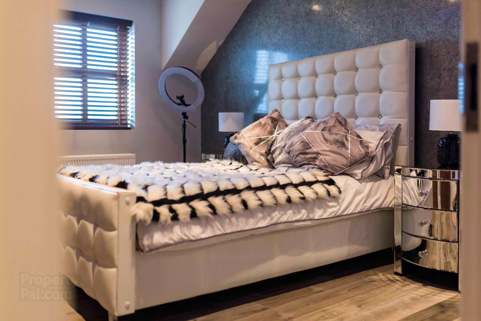 5.66m x 3.75m Spacious double bedroom. Feature dormer windows and gable window. TV pt. Grey gloss laminated wooden flooring. Spot lighting. Triple aspect. Panoramic view.