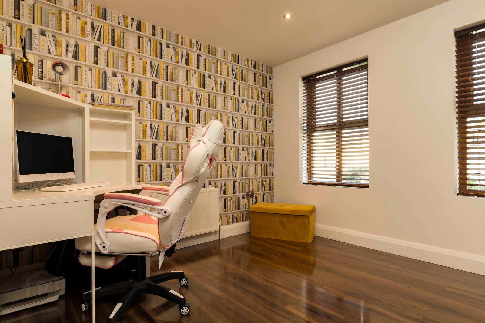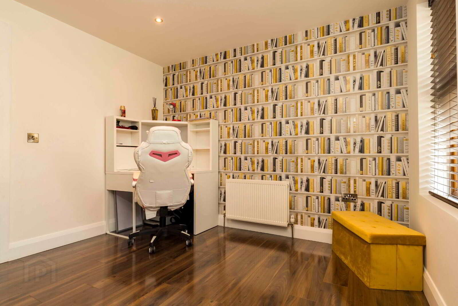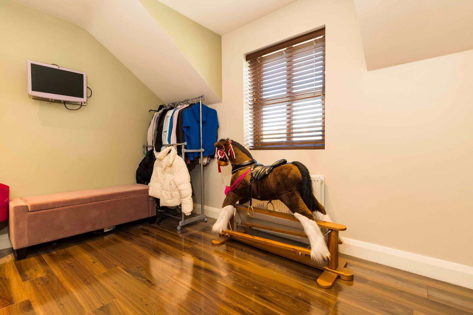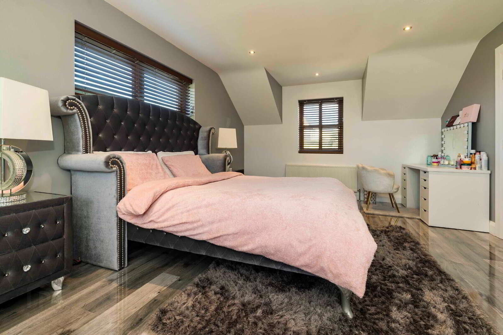 5.66m x 3.75m Spacious double bedroom. Feature dormer windows and gable window. TV pt. Grey gloss laminated wooden flooring. Spot lighting. Triple aspect. Panoramic view.