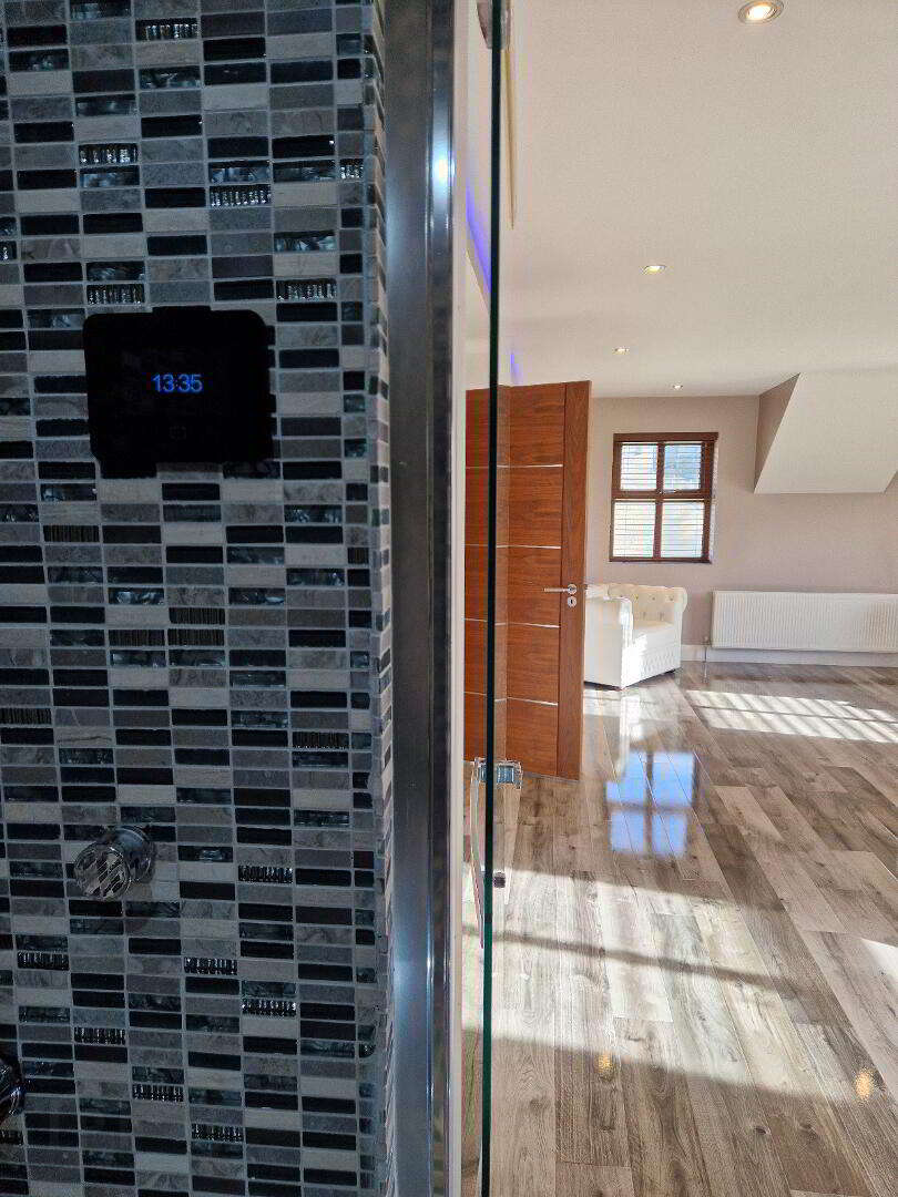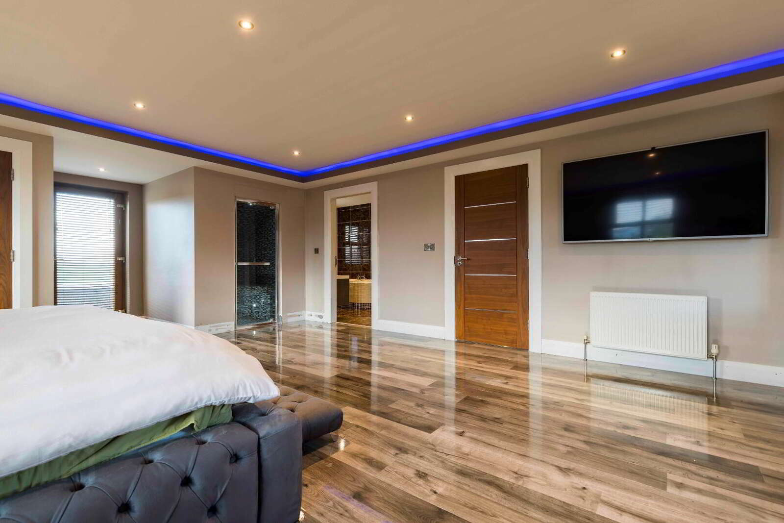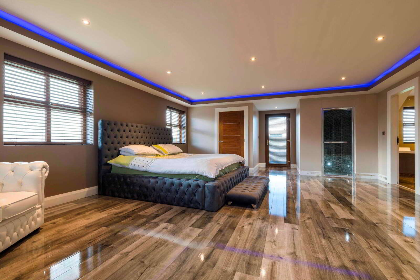 6.62m x 5.35m Very spacious double bedroom. Grey gloss laminate wooden flooring. TV pt. Twin dormer windows. Gable window and glazed door leading to balcony. Spot lighting and ambient strip lighting within feature ceiling. Triple aspect. Panoramic view. Walk-in wardrobe and feature sauna. Sauna / Steam room is fully tiled and has ambient LED lighting plus bluetooth technology.