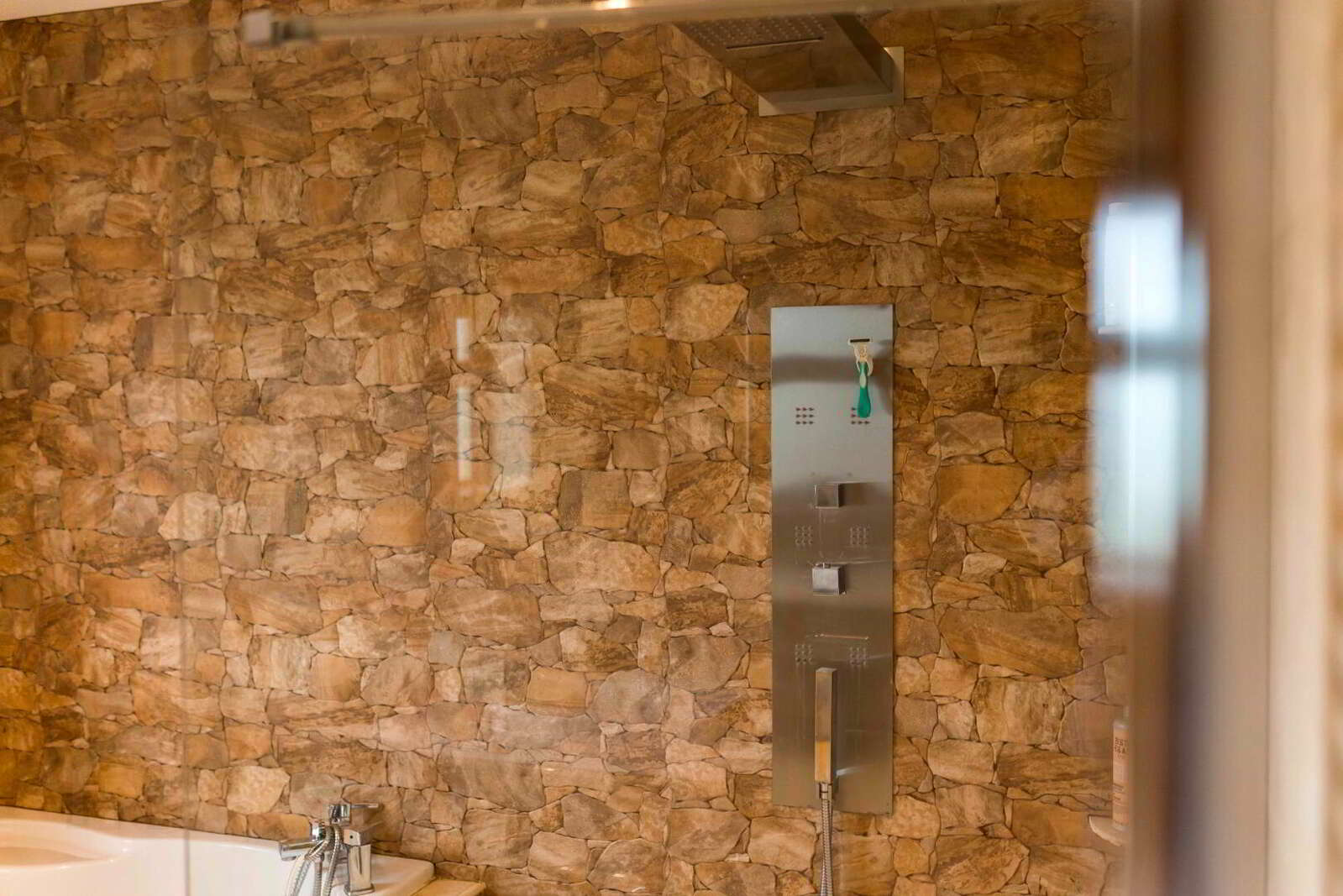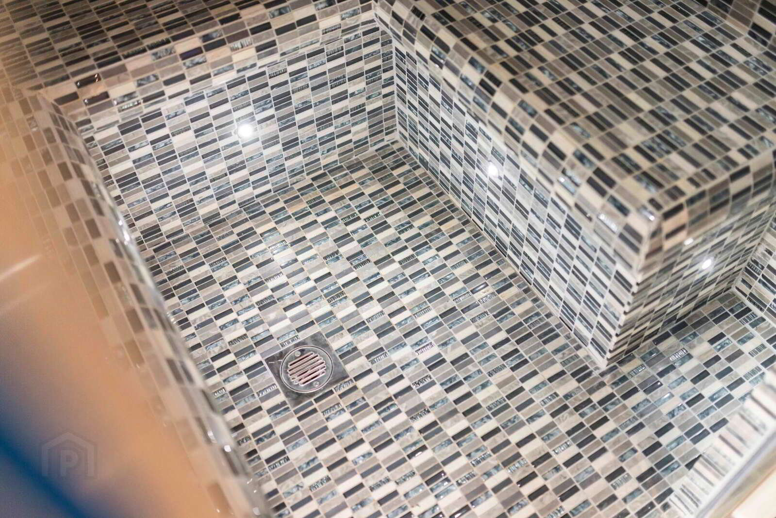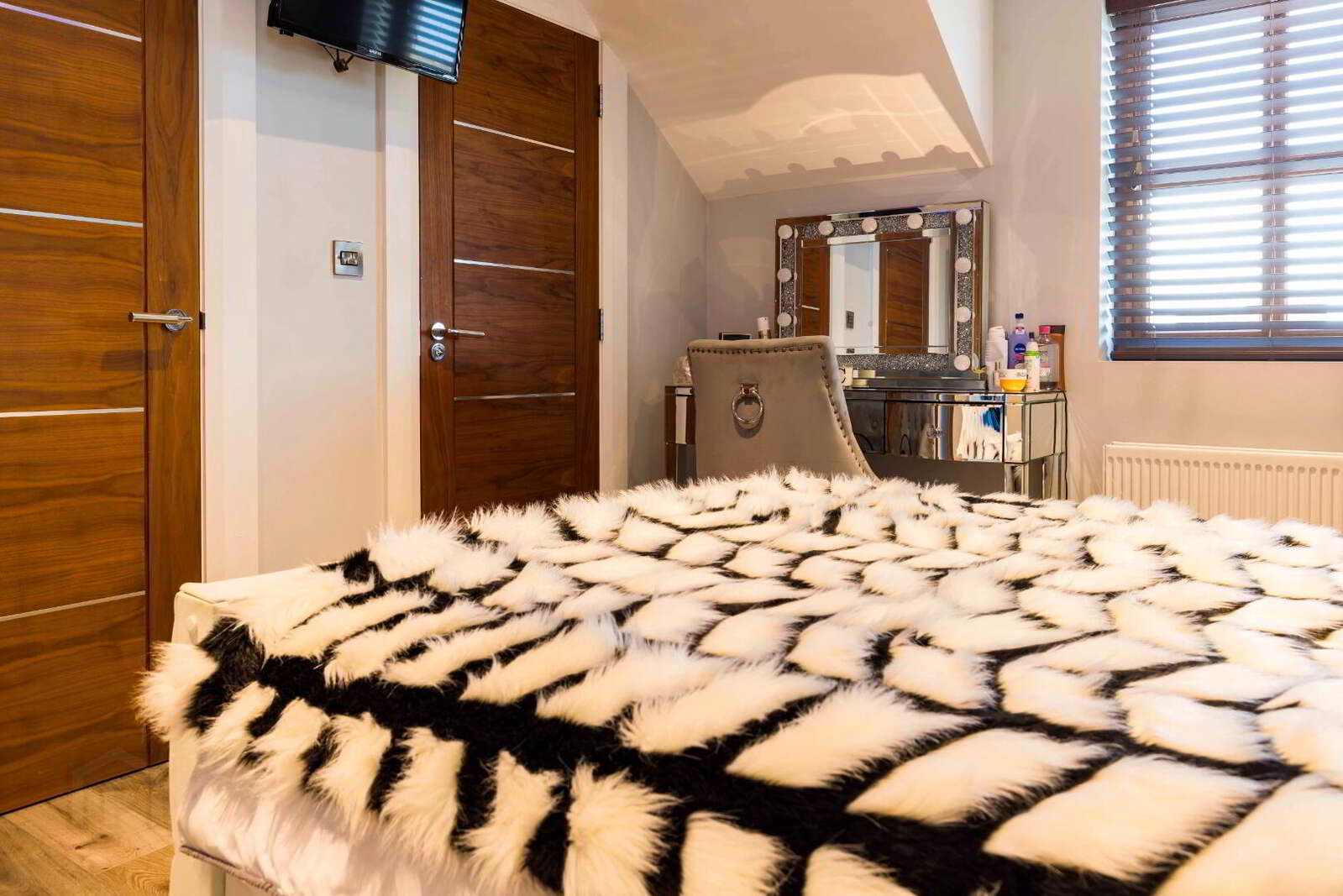 6.62m x 5.35m Very spacious double bedroom. Grey gloss laminate wooden flooring. TV pt. Twin dormer windows. Gable window and glazed door leading to balcony. Spot lighting and ambient strip lighting within feature ceiling. Triple aspect. Panoramic view. Walk-in wardrobe and feature sauna. Sauna / Steam room is fully tiled and has ambient LED lighting plus bluetooth technology.