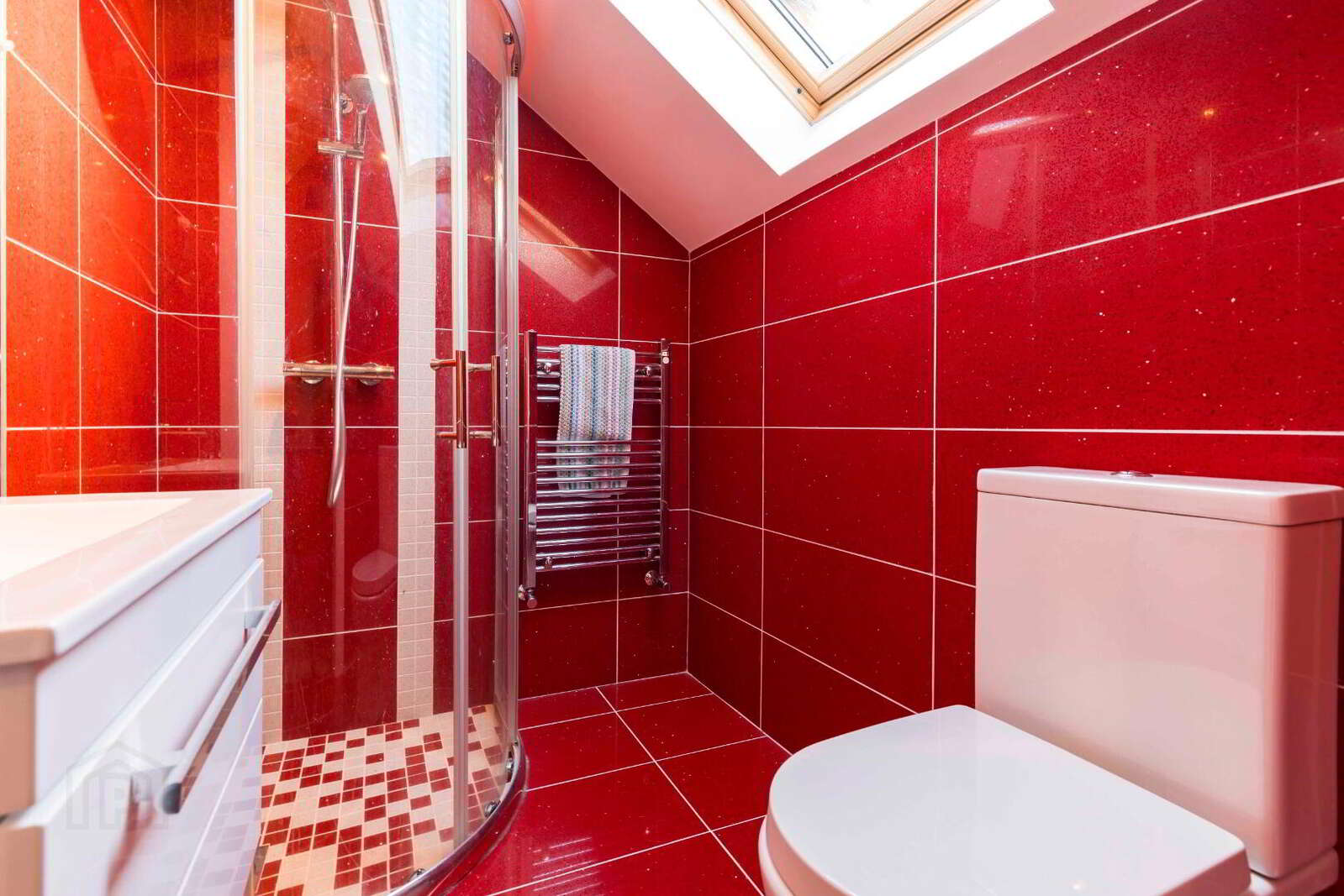 1.63m x 1.58m White suite comprises a walk-in quadrant shower unit with thermostatic shower fitting; wash hand basin with vanity unit; and WC. Chrome heated towel rail. Polished porcelain tiled and walls. Spot lighting. Fan. Velux window. Rear aspect.