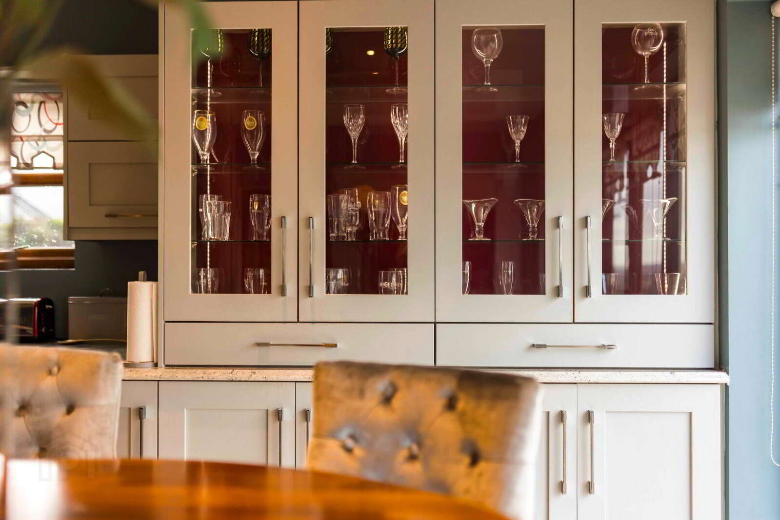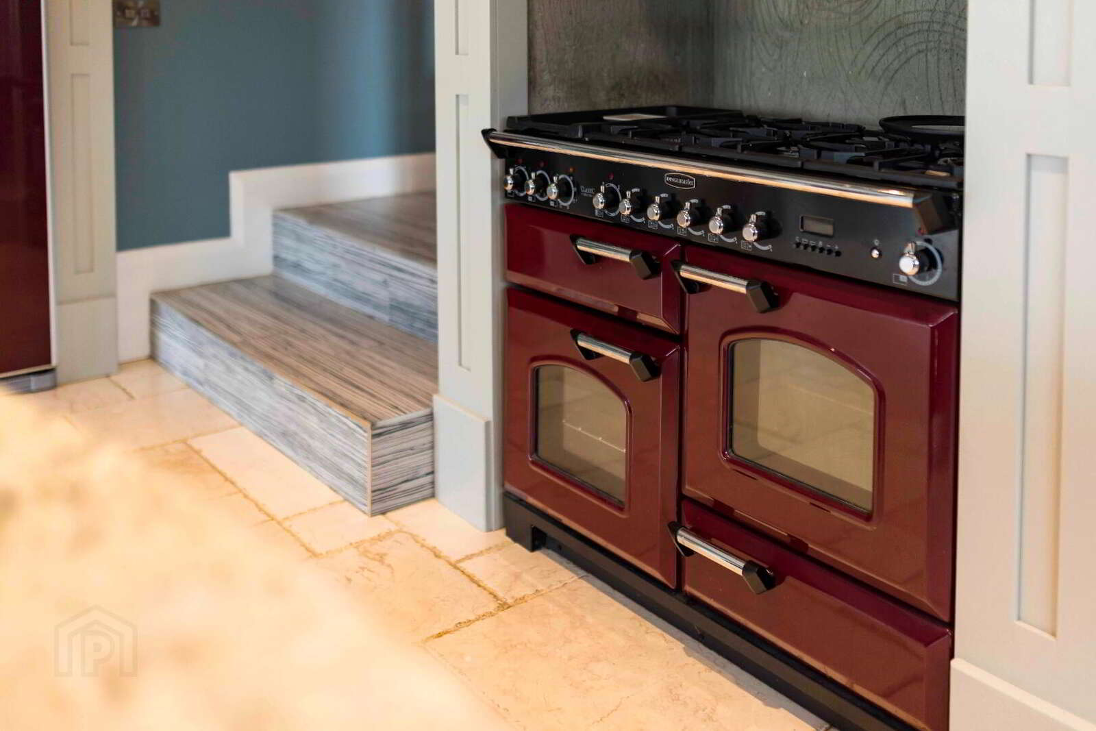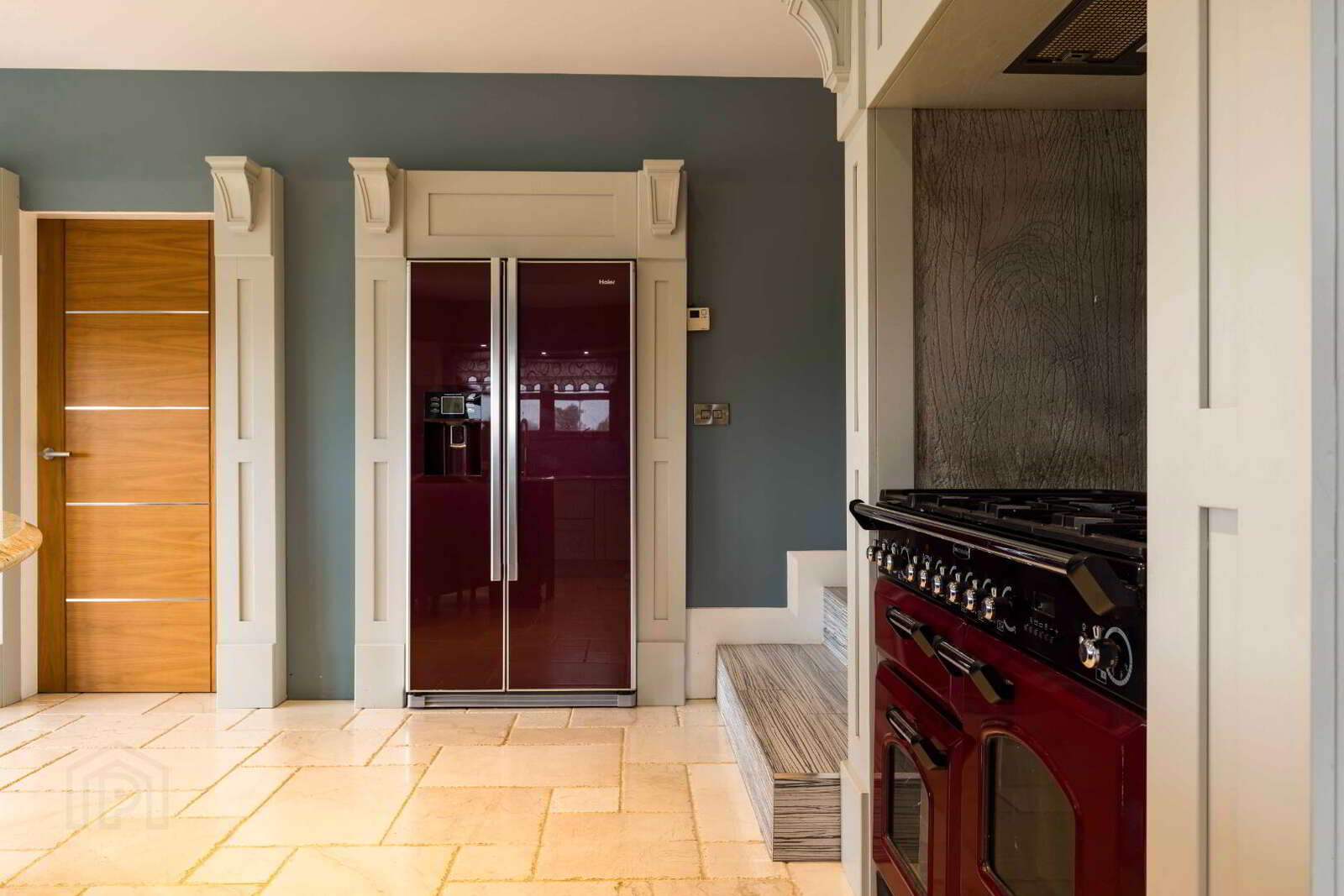 5.58m x 5.34m Luxury fitted kitchen units plus bespoke designed breakfast bar finished with high gloss render and feature quartz and walnut worktops. Glass display. Integrated wine cooler and dishwasher. Franke 1 1/3 bowl stainless steel sink. Rangemaster dual fuel cooker with canopy fan hood over, and Haier American style