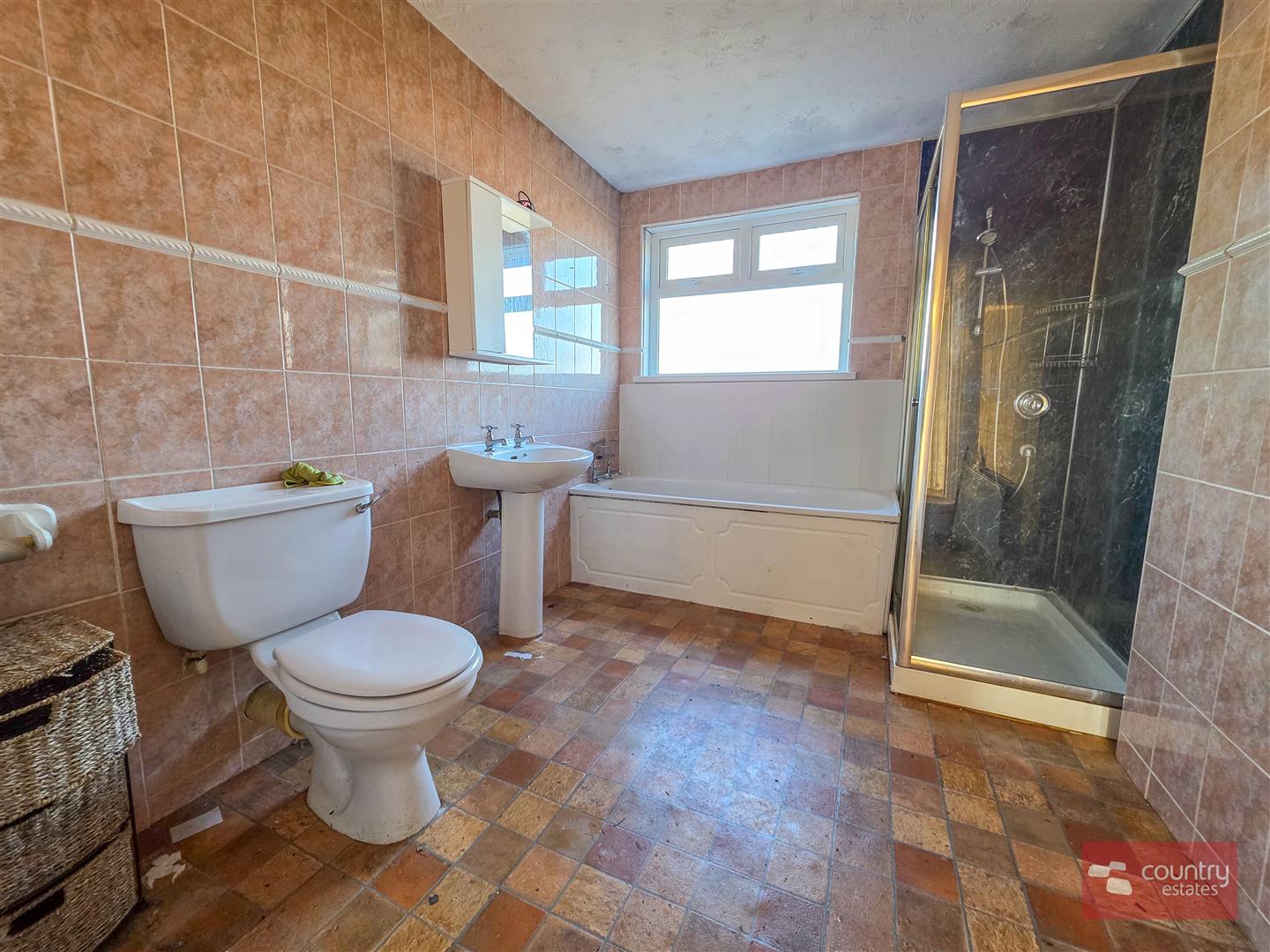 Comprising panel bath, PVC panelled shower cubicle with thermostatically controlled shower, pedestal wash hand basin and low flush WC. Tiled walls.