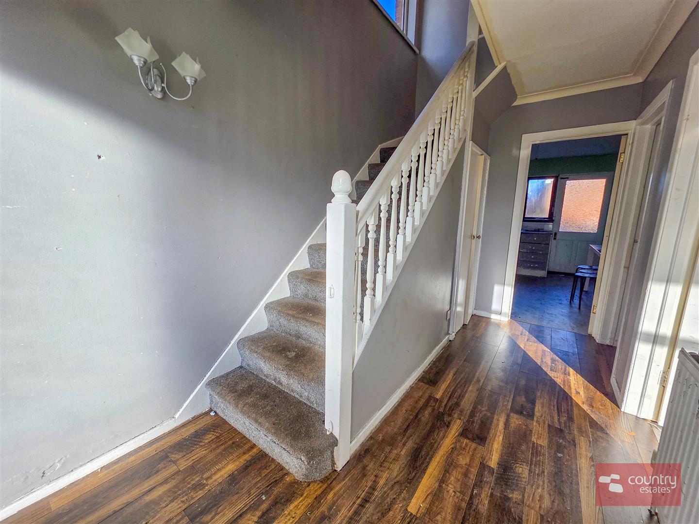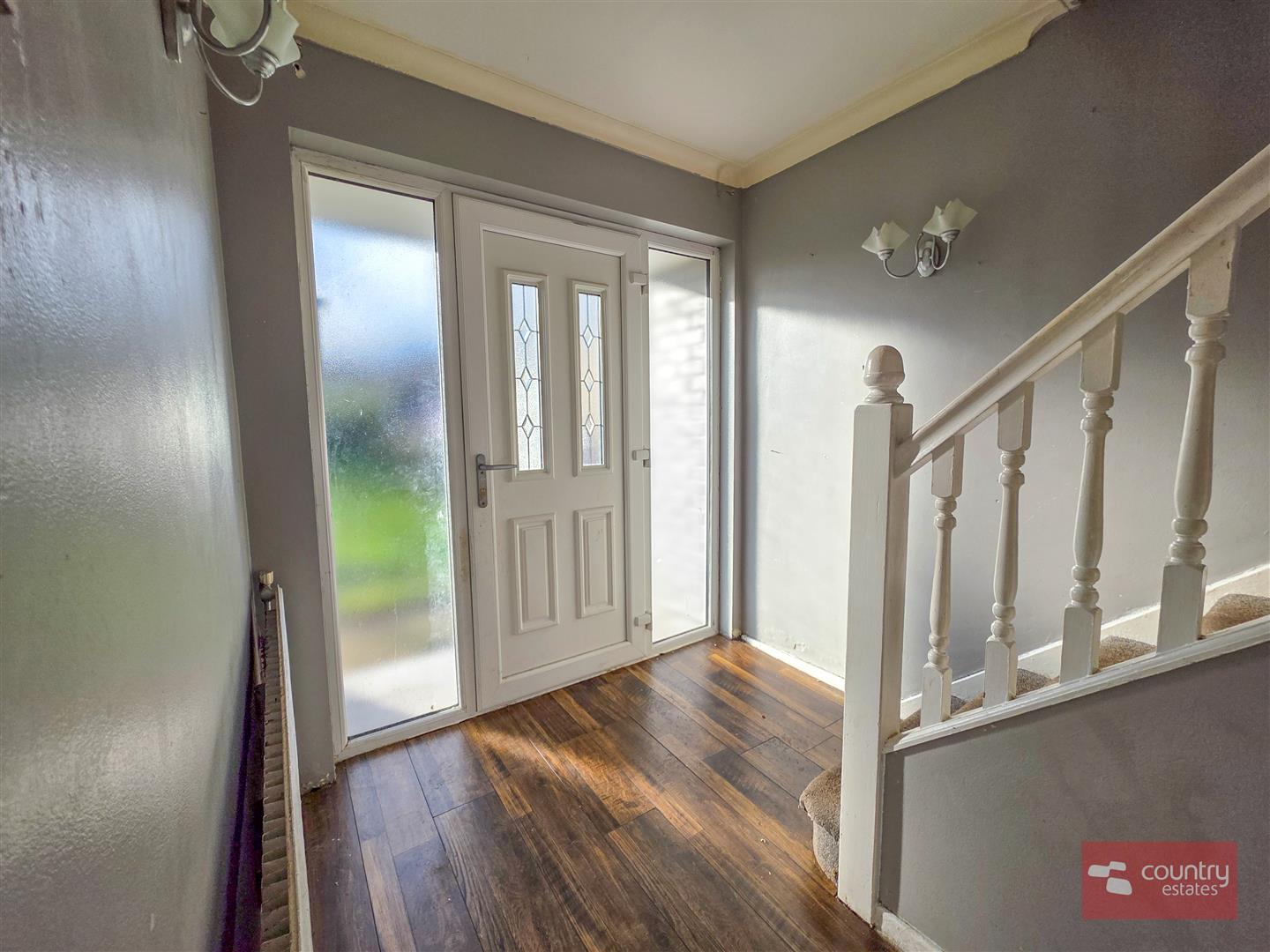 PVC Double glazed front door with leaded glass inset and side screens into spacious entrance hall with laminate flooring.