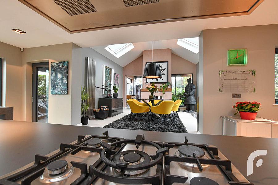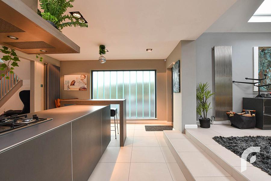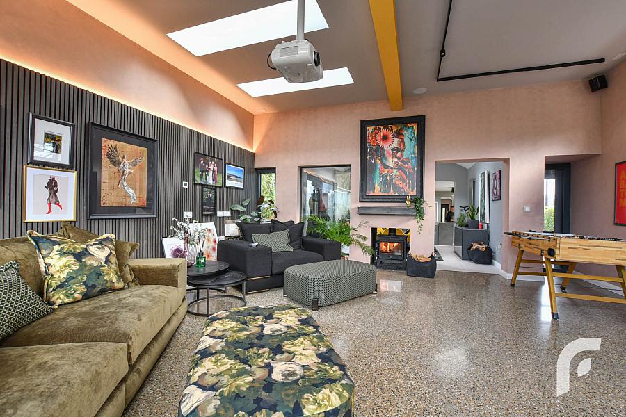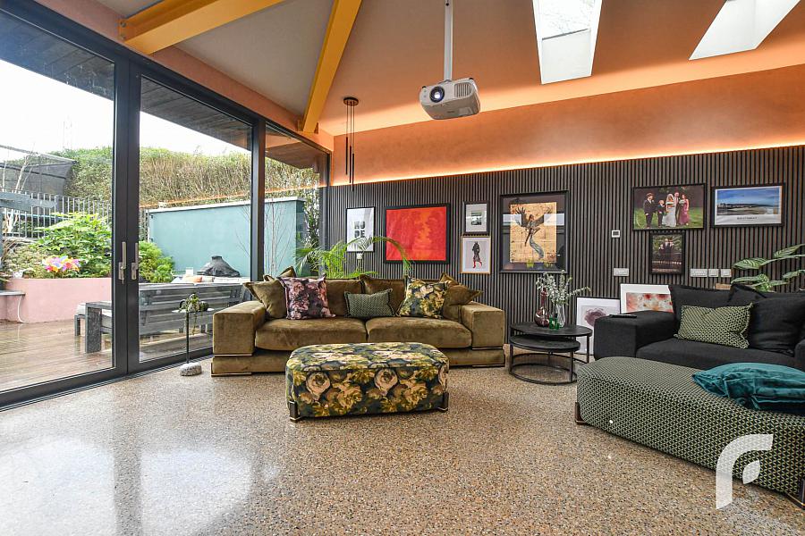 Family/Cinema Room - 20`4` x 20`5` - 12ft high ceiling, two roof lights, exposed steel beams, tunnel log burner, 6m glazing, polished concrete flooring with underfloor heating.