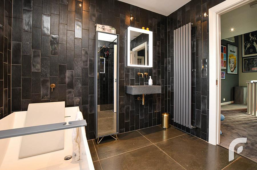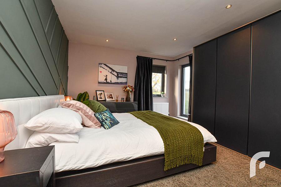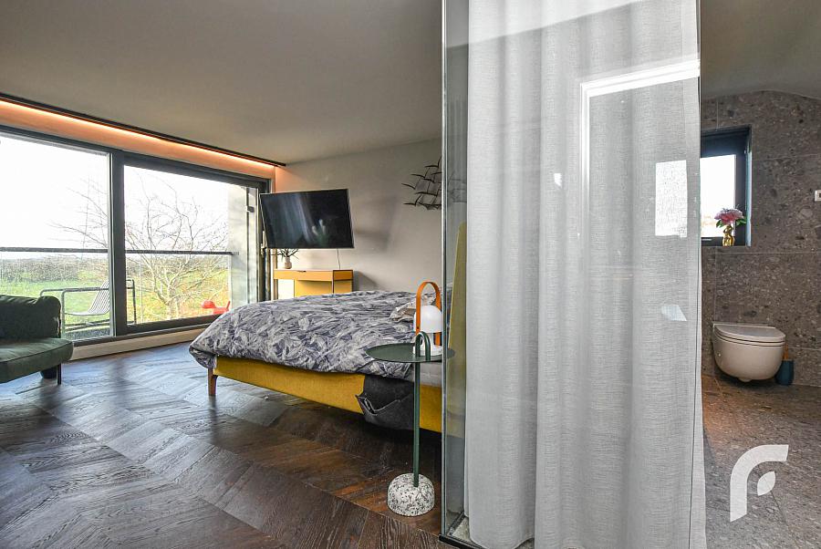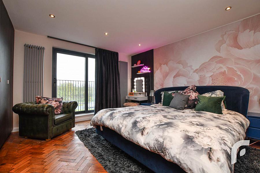 Bedroom 1 - 18`5` x 13`2` - shop fitted walk-in wardrobe, sliding patio door leading to balcony (countryside views), glass partition walling between bathroom & bedroom, black oak herringbone engineered flooring.