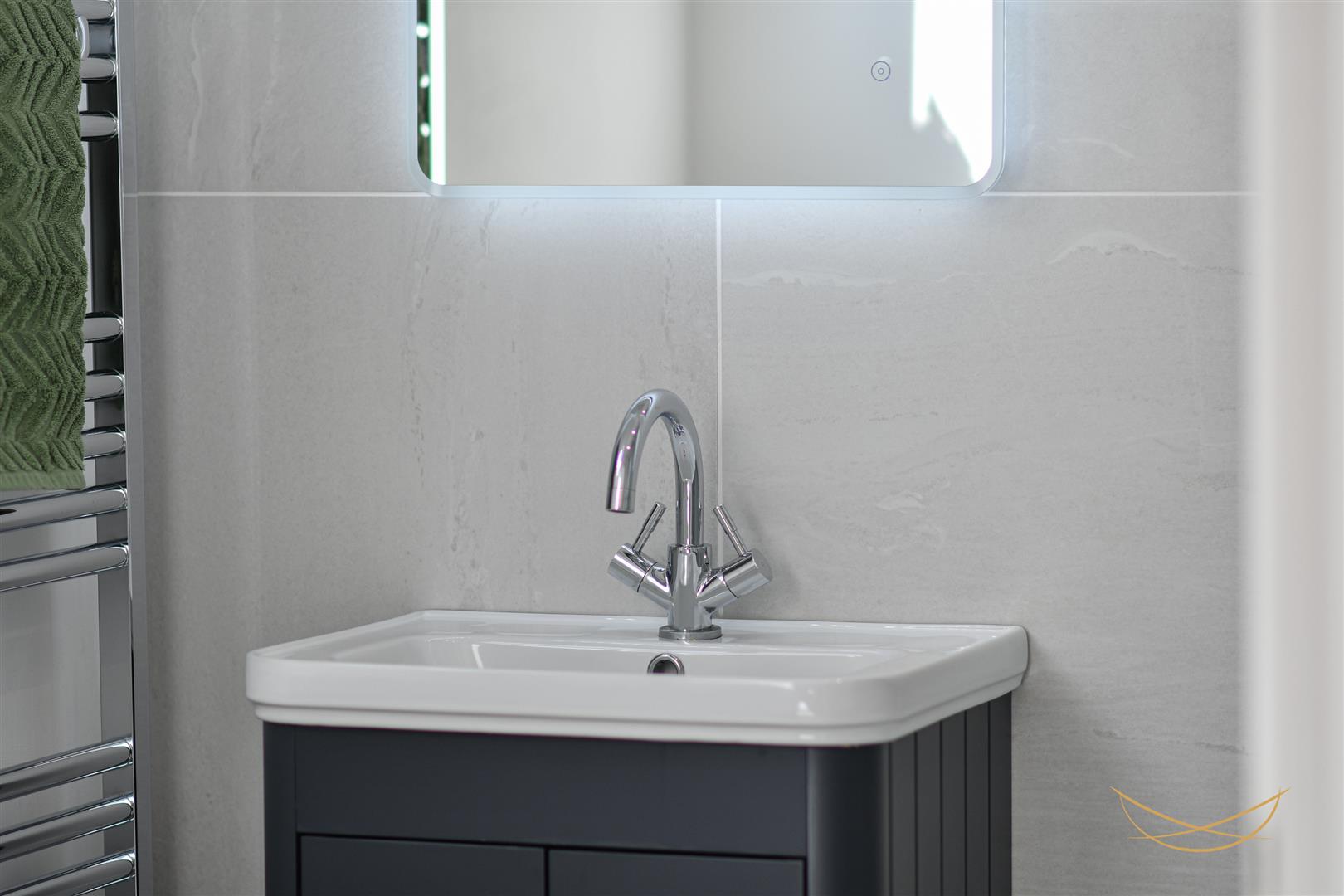 Luxury three piece suite comprising low flush w/c, enclosed shower unit (Thermostat controlled) with pressurised rainfall shower. Vanity unit with chrome mixer tap. Mosaic tiled splashback. Tiled flooring. Chrome towel radiator.