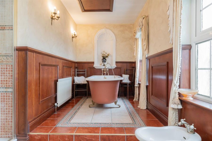 Traditional white suite comprising high level wc, bidet, free standing bath with telephone hand shower set, corner shower enclosure with mosaic tiling, overhead shower and sliding glass doors, pedestal wash hand basin, tiled flooring, part panelled walls, ceiling rose, feature stained glass window, access to roofspace.