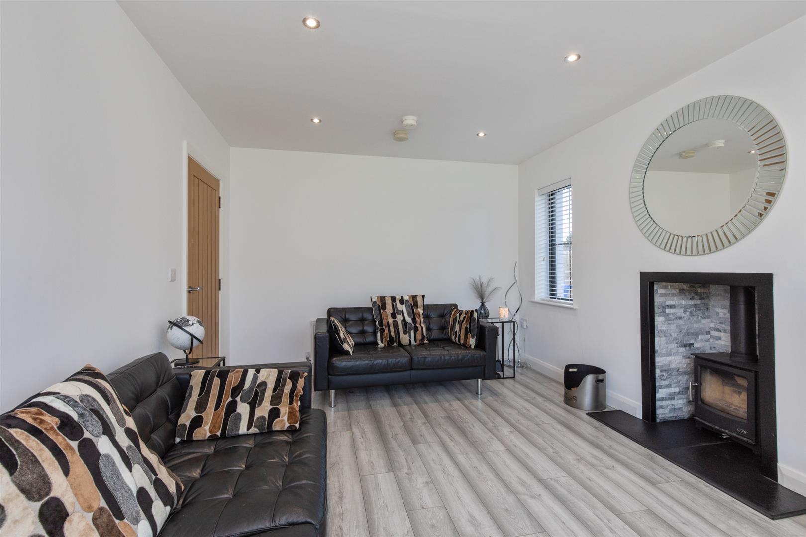 Multi-fuel burning stove with tiled hearth, dual aspect windows, recessed spotlighting, wood laminate floor and bay window.