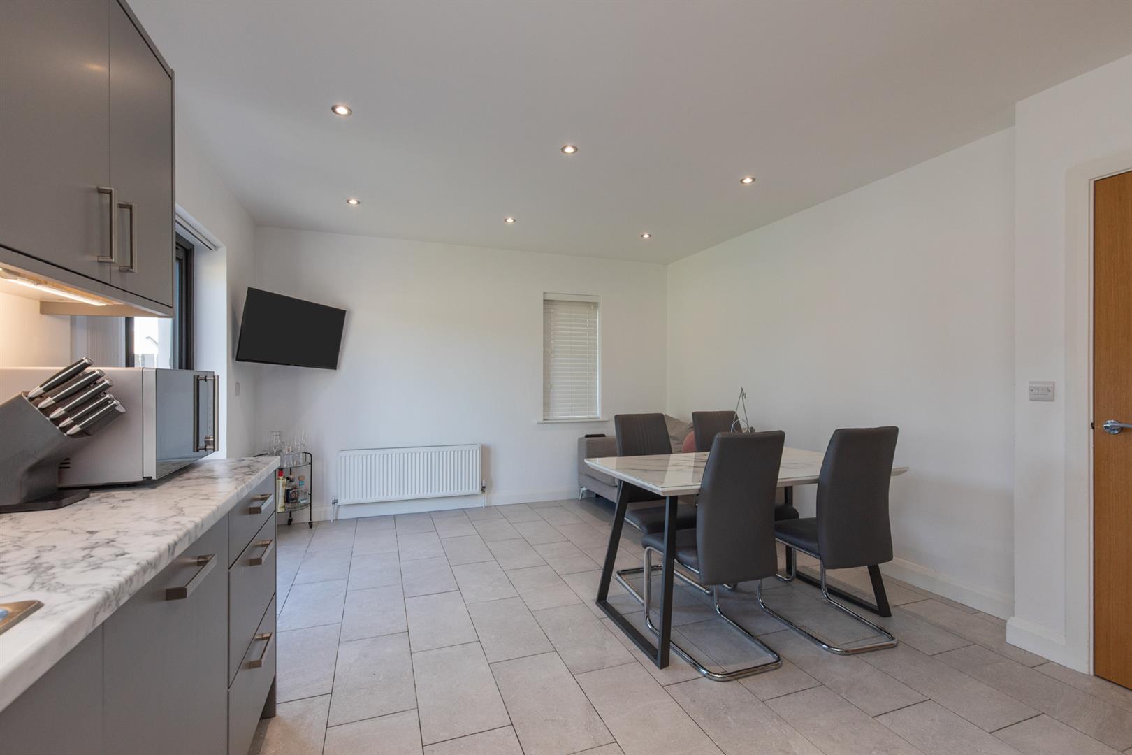 Luxury kitchen with a range of high and low level units, granite effect laminate work surfaces and upstands, inset stainless steel sink unit with mixer tap and drainer, integrated appliances to include; electric under oven, four ring gas hob, stainless steel extractor hood, fridge freezer and dishwasher, plumbed for washing machine, recessed spotlights, tiled flooring, space for dining and double doors to rear garden.