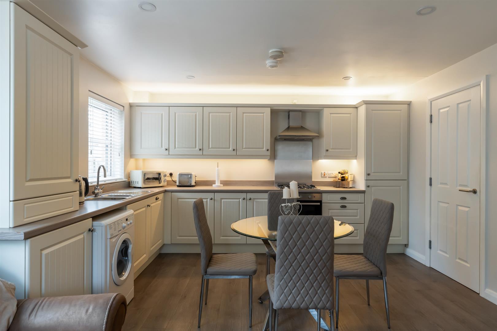 Modern range of high and low level units, wooden effect work surfaces, stainless steel sink with mixer tap, 4 ring gas hob with electric under oven, stainless steel extractor fan and hood, stainless steel splashback, integrated dishwasher, space for washing machine, gas fired boiler, wood laminate floor, storage cupboard, electric fire.