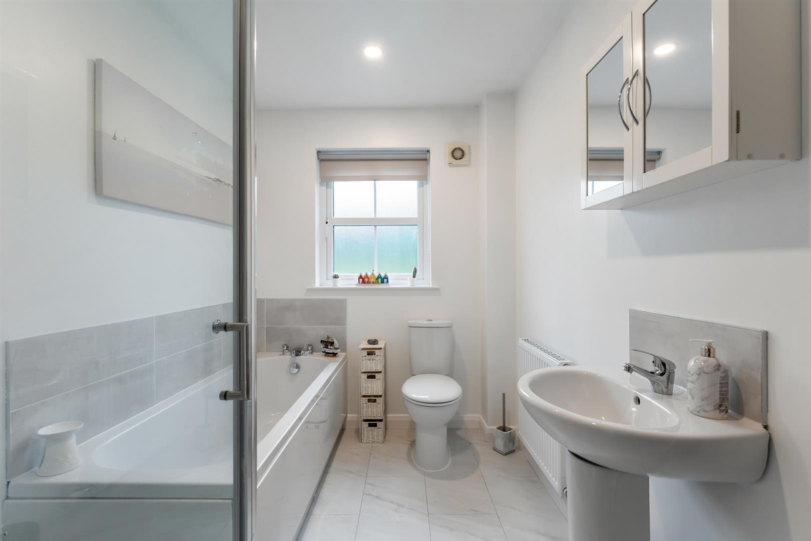 Modern white suite comprising panelled bath with mixer tap, low flush wc, pedestal wash hand basin, fully tiled shower cubicle with thermostatic shower, tiled floor, extractor fan.