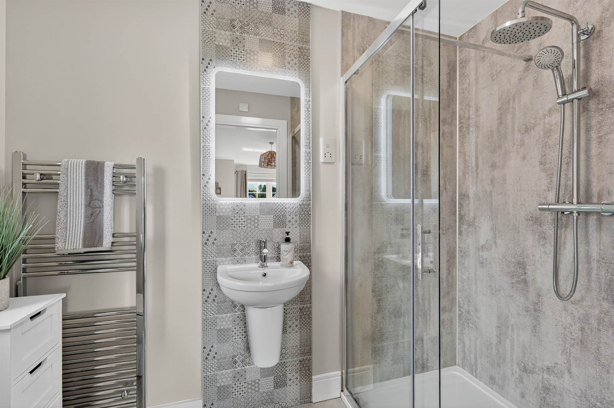 Low flush WC, heated towel rail, sink with chrome mixer tap, walk in shower with telephone and rain head attachments, part tiled walls, ceramic tiled floor.