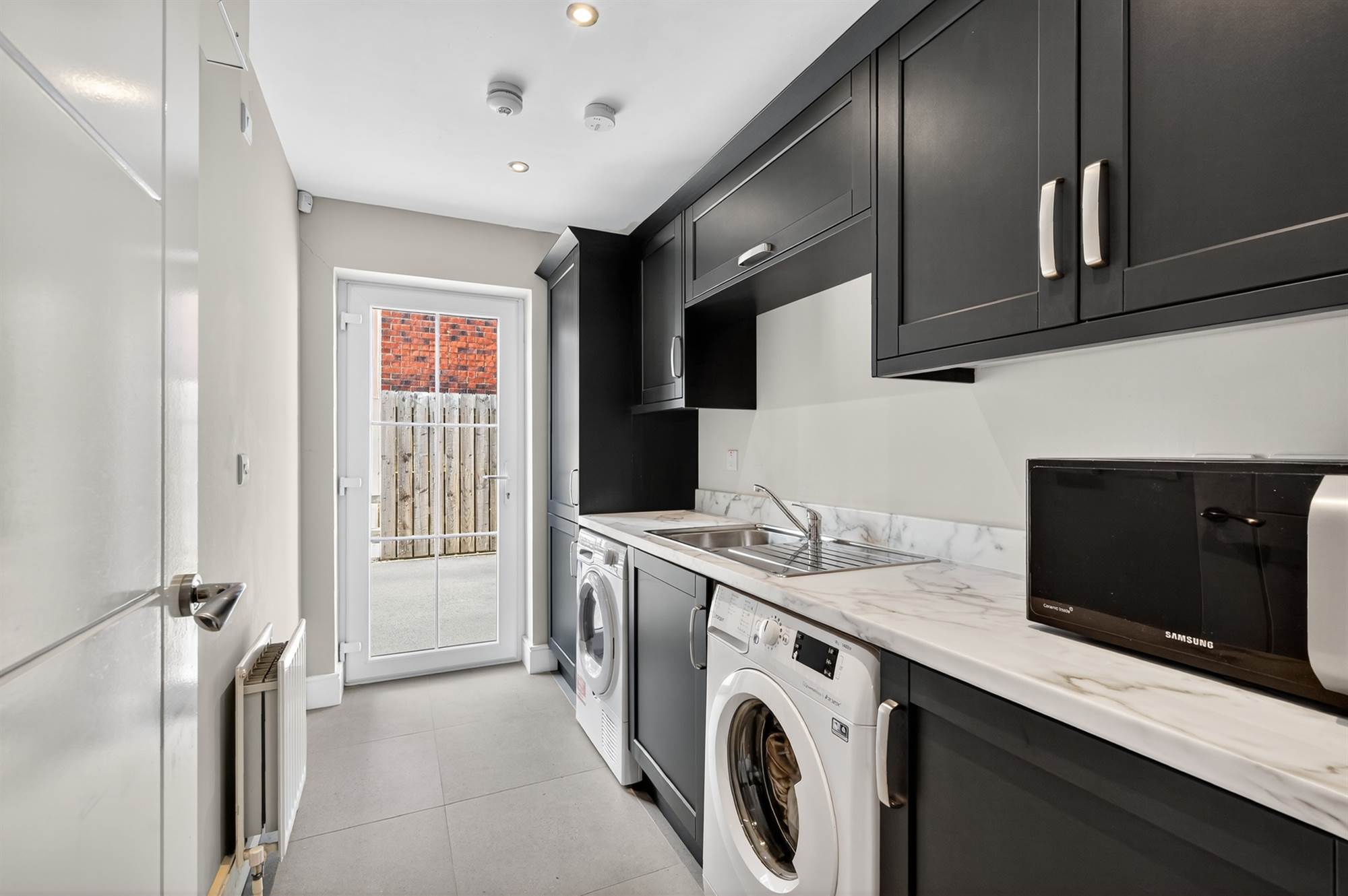 Access to side, stainless steel sink with chrome mixer tap, high and low level units, plumbed for washing machine and tumble dryer, houses the gas boiler, ceramic tiled floor, low voltage spotlighting.