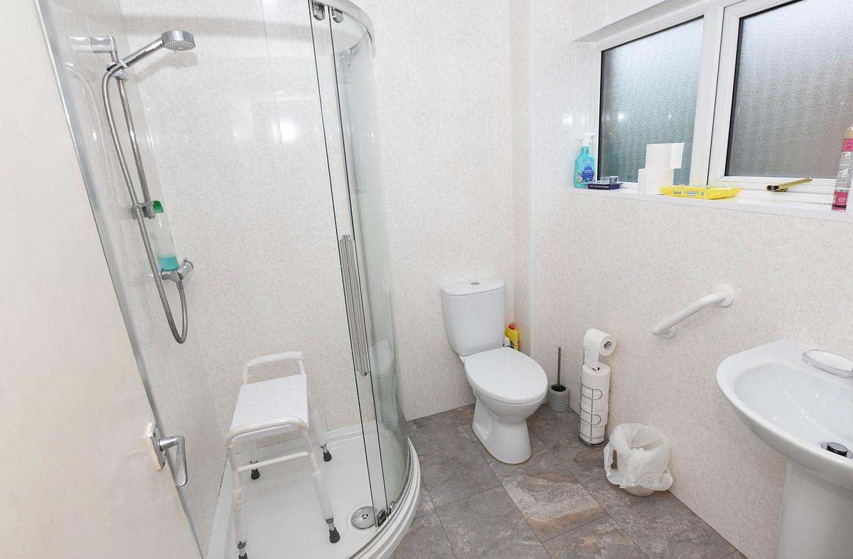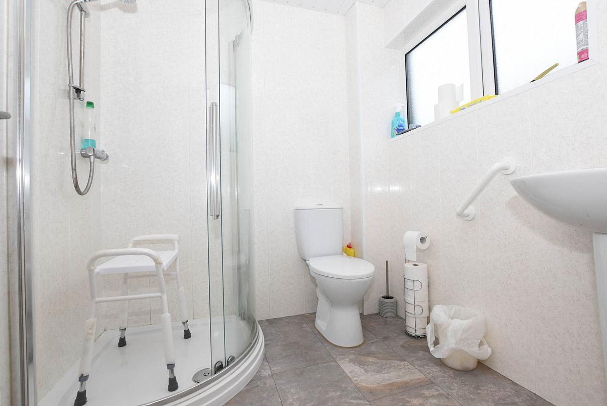 Pedestal wash hand basin. Low flush w.c. Shower cubicle with shower. Panelled walls.