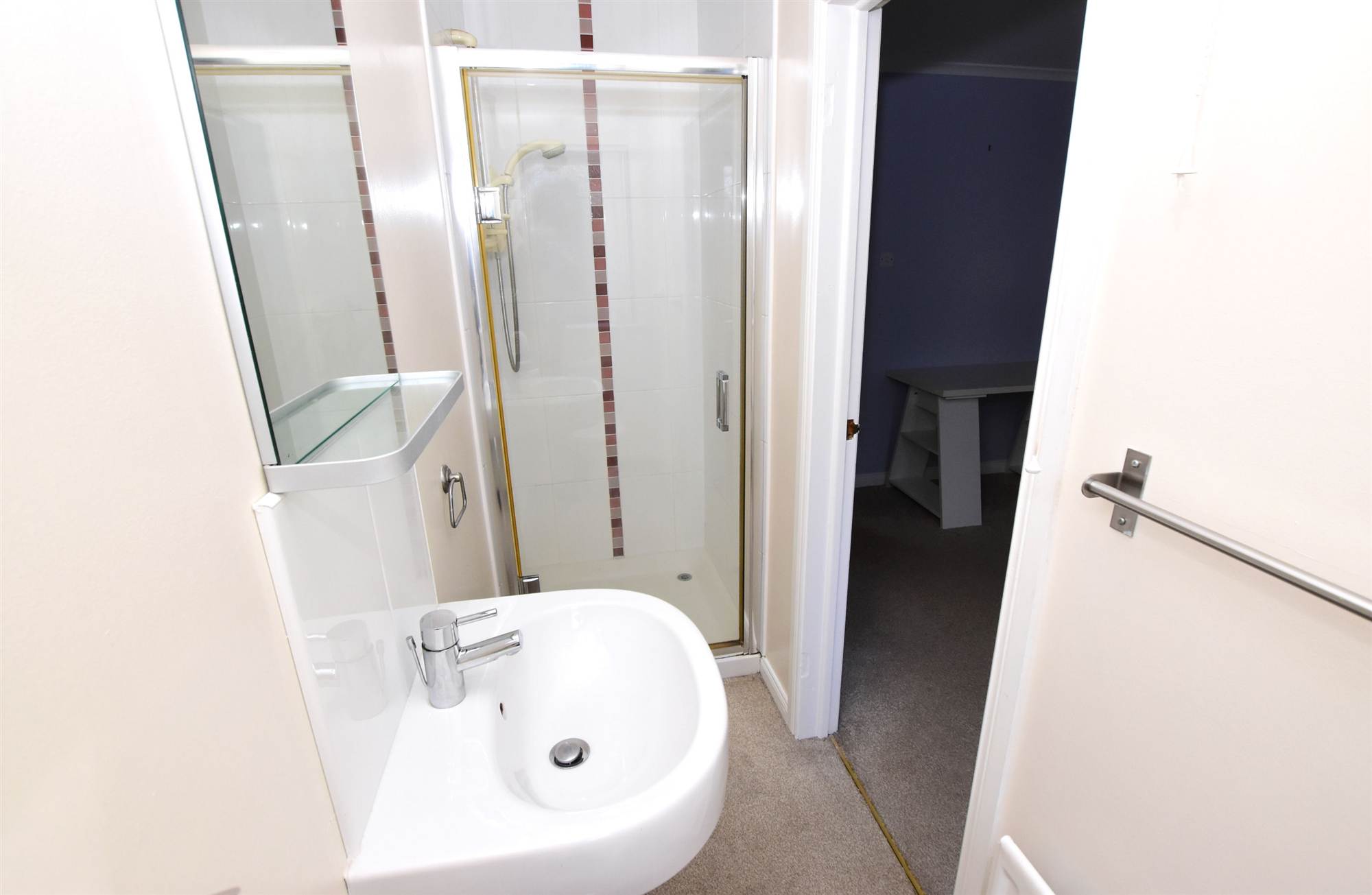 ENSUITE SHOWER ROOM: Fully tiled shower cubicle with "Mira" thermostatically controlled shower unit, wash hand basin, low flush WC, extractor fan.