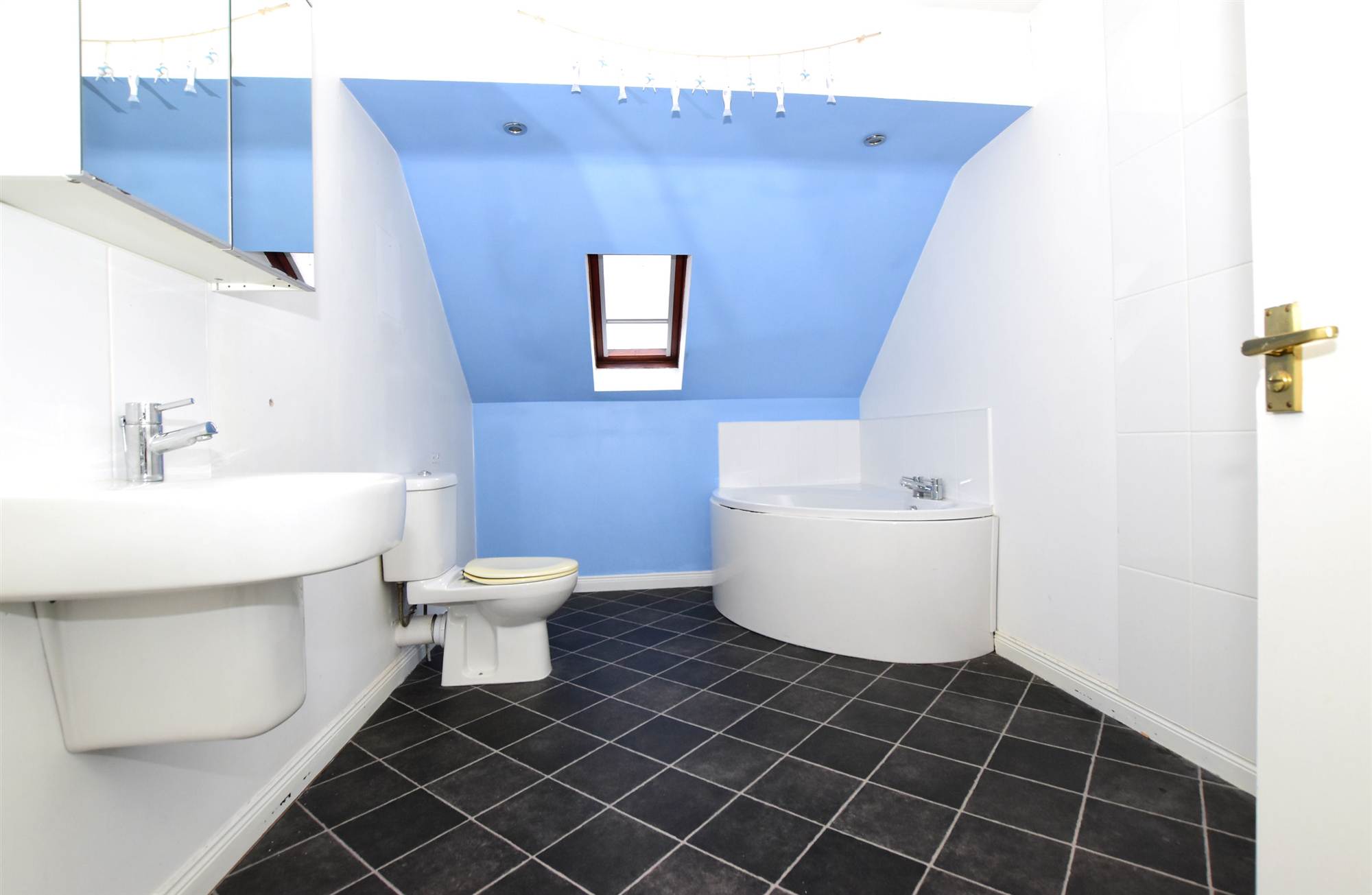 BATHROOM: White suite comprising panelled corner bath with mixer taps, fully tiled shower cubicle, wash hand basin with mixer taps, low flush WC, wall tiling, heated chrome towel rail.