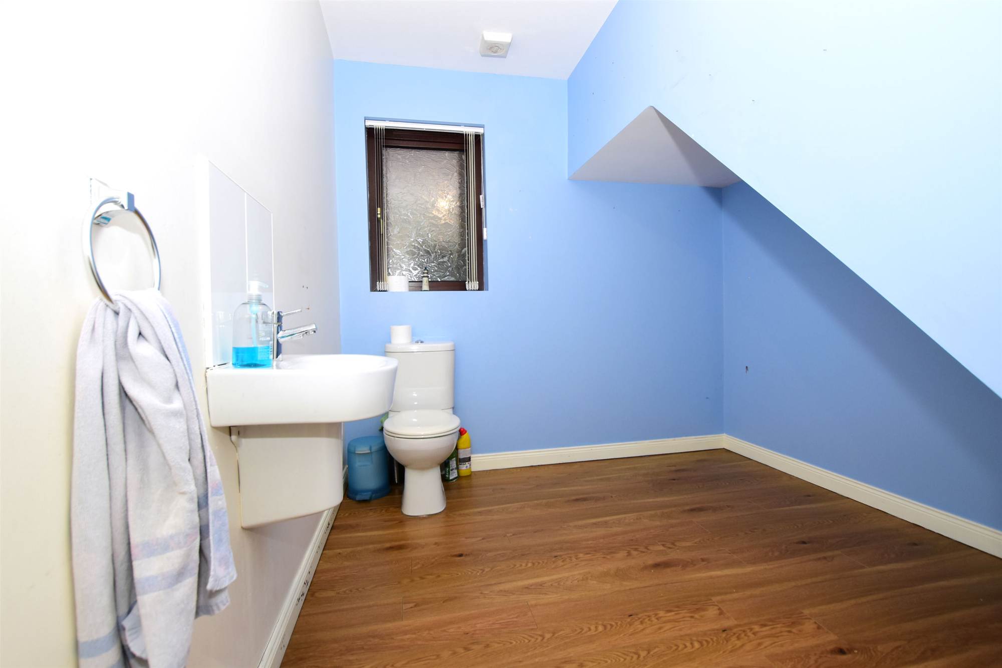 CLOAKROOM: White suite comprising wash hand basin, low flush WC, polished laminate floor.