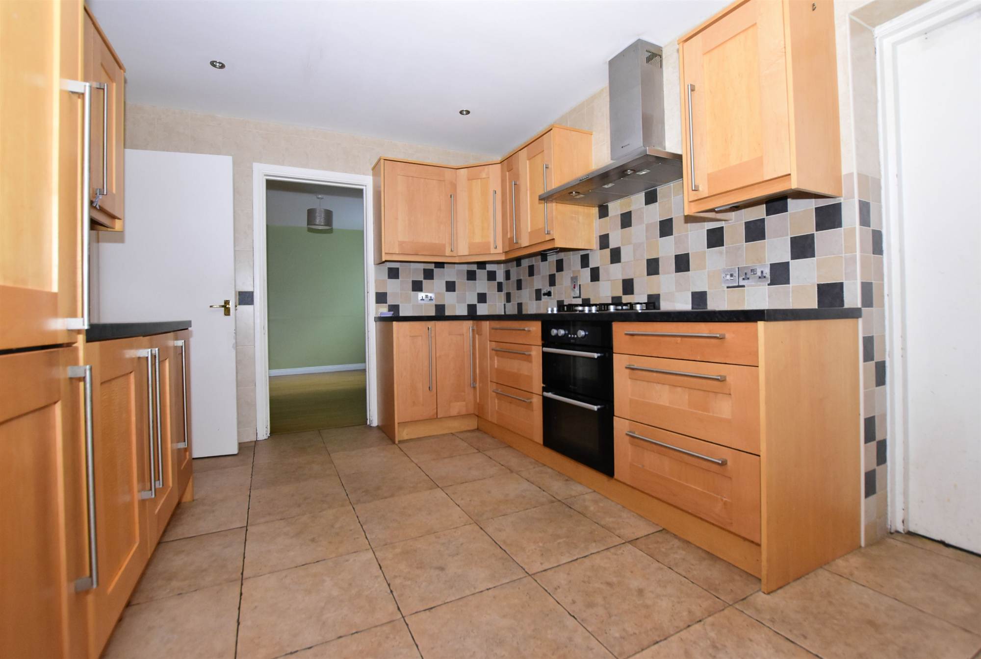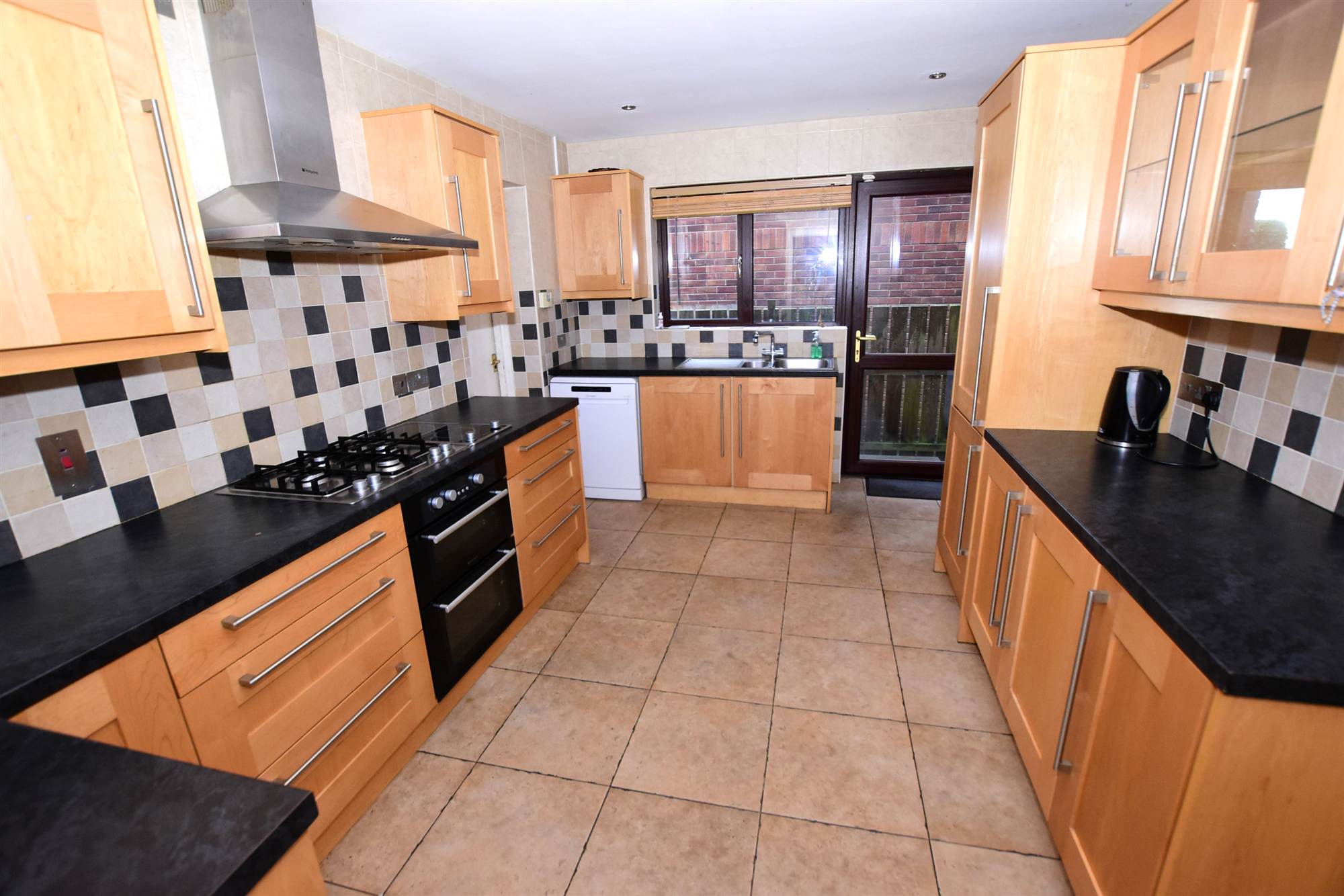 FITTED KITCHEN : 14' 3" X 9' 6" (4.34m X 2.90m) 1 ½ Tub single drainer stainless steel sink unit with mixer taps, range of high and low level units, formica round edged work surfaces, built-in double oven, four ring hob unit, extractor hood, plumbed for dishwasher, integrated fridge / freezer, wall tiling, ceramic tiled floor.