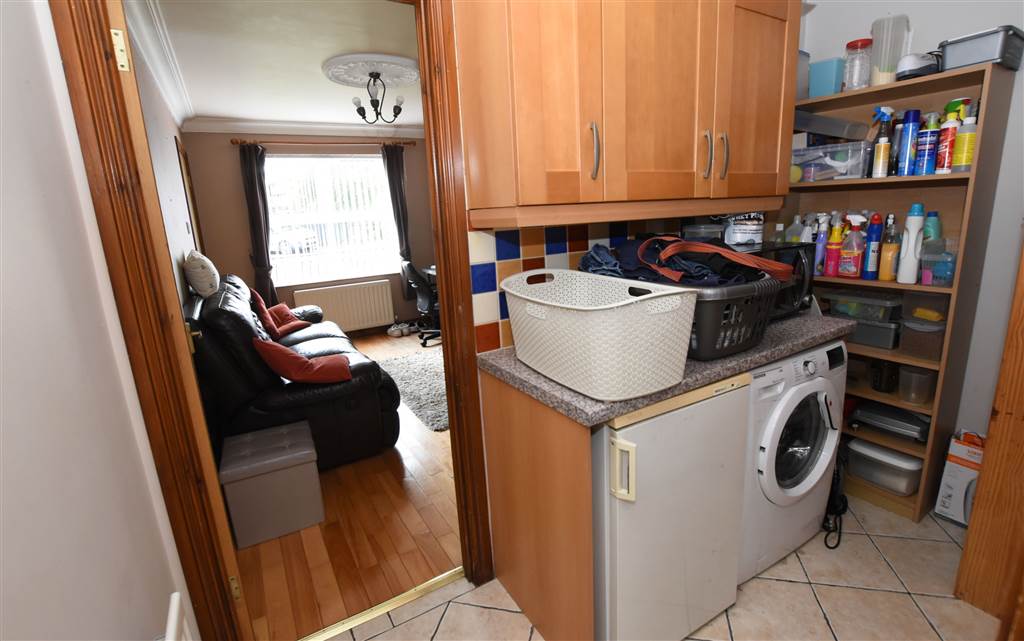 This room has a selection of storage cupboards, space for under counter fridge or condenser drier and also plumbing for a washing machine. The walls are partially tiled and the floor is tiled.